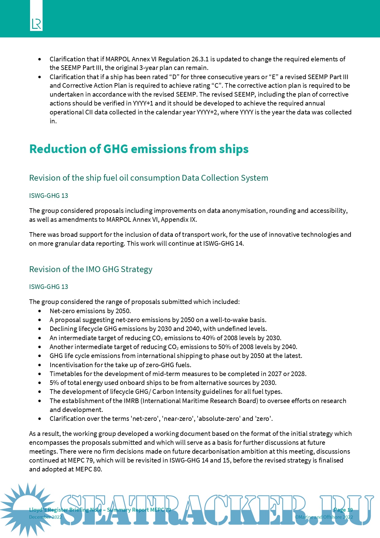 Description: ISWG-GHG 13 took place 5-9 December 2022 and MEPC 79 on 12-16 December 2022. This report summarises the discussions and outcomes which are significant to Lloyd’s Register’s work with our customers.