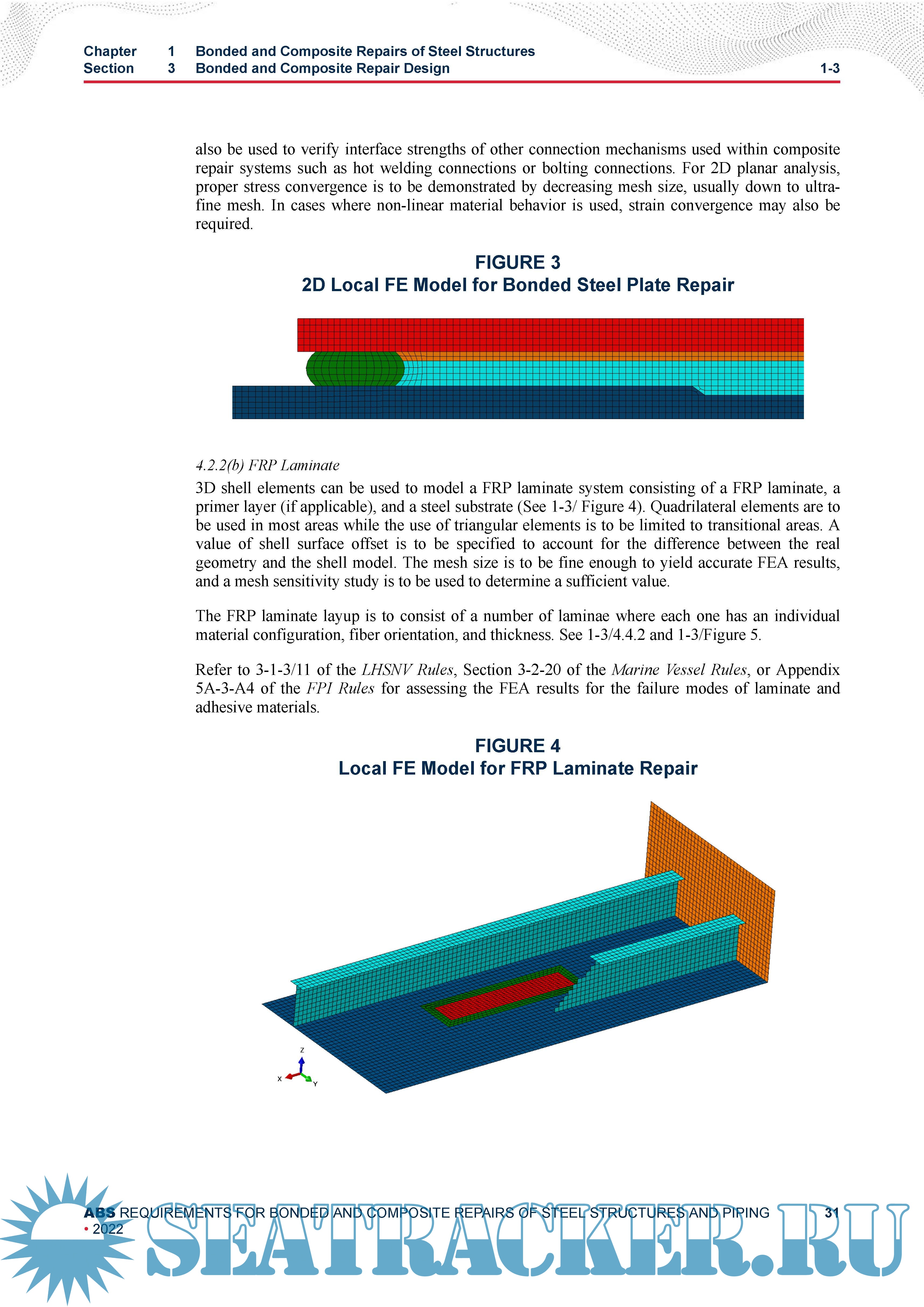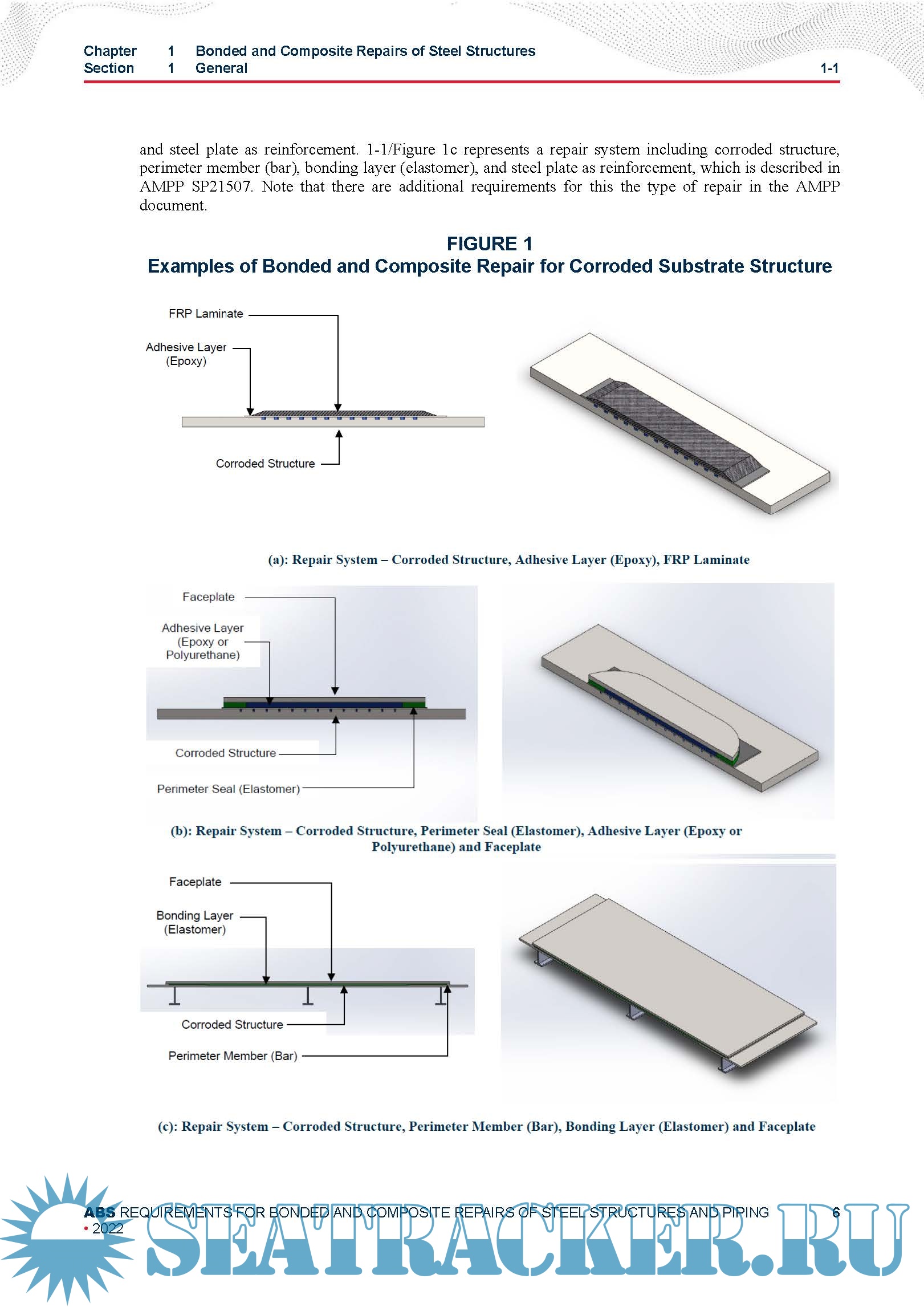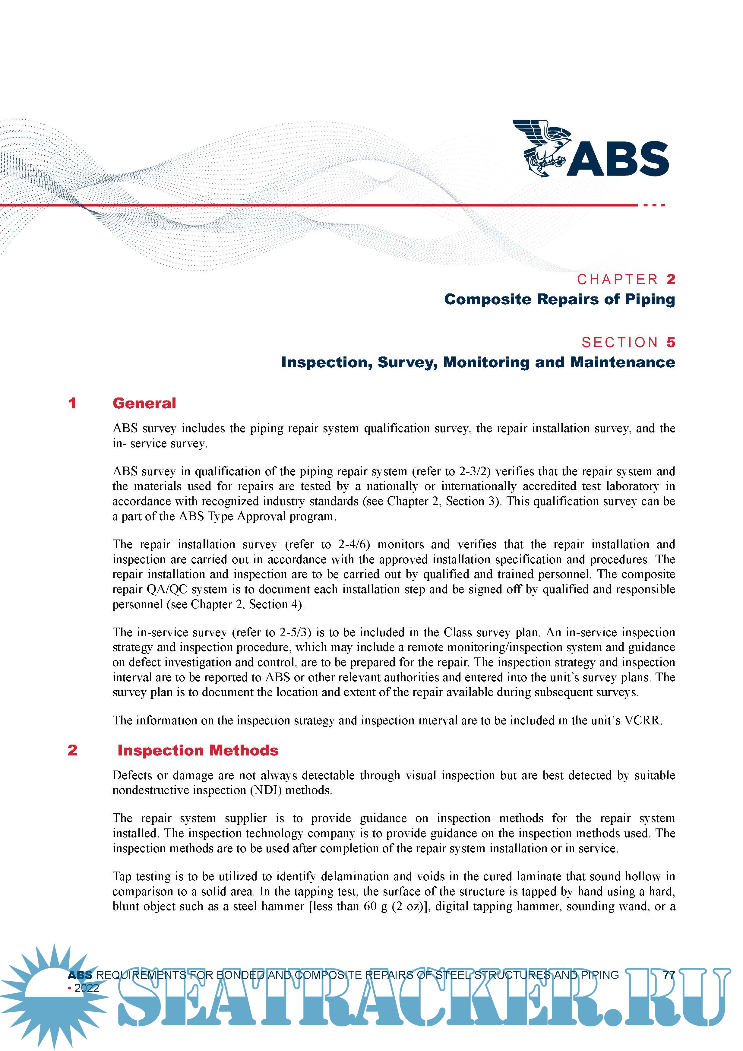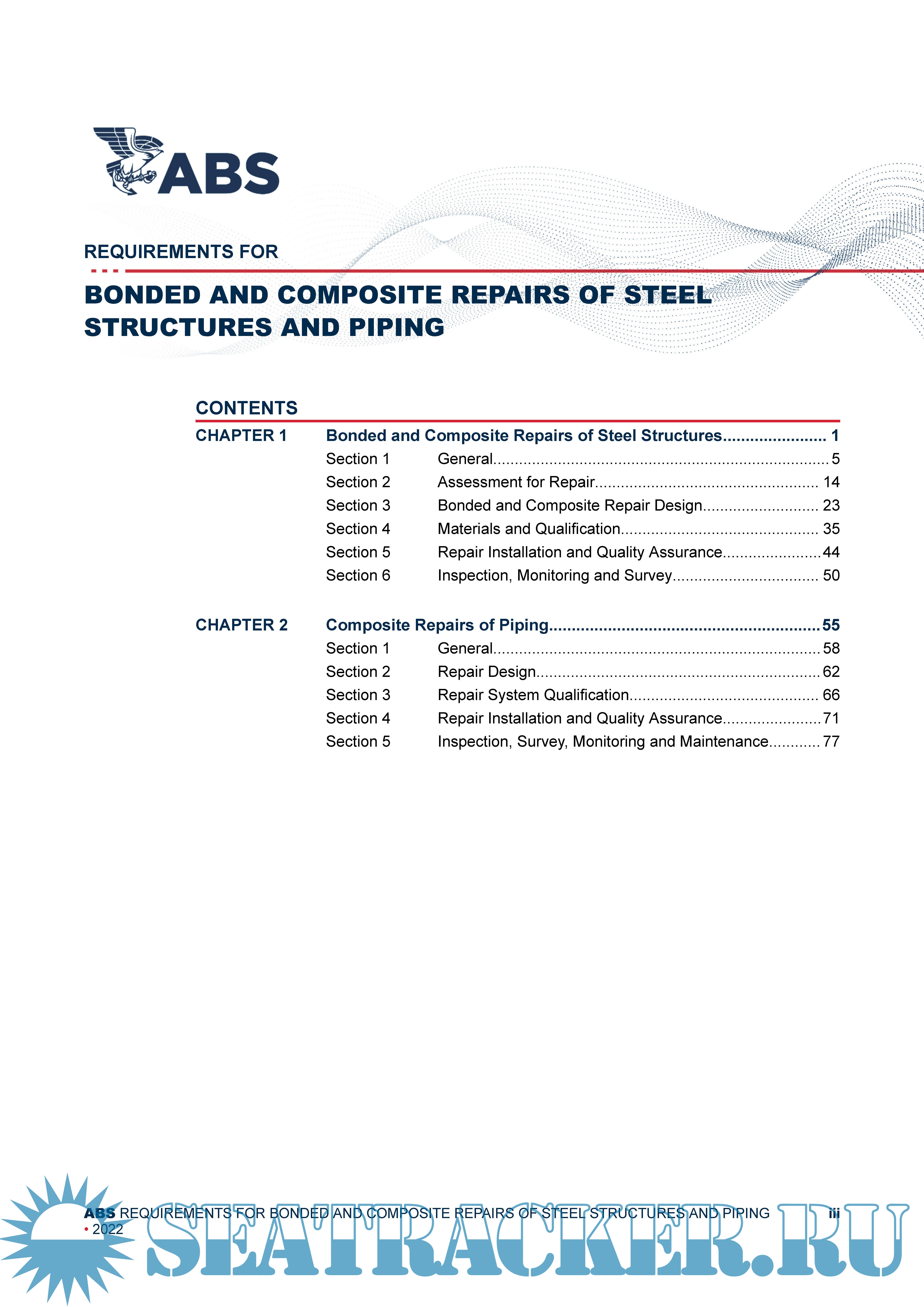 Year: 2022 Language: english Author: ABS Genre: Guide Edition: November, 2022 Format: PDF Quality: eBook Pages count: 83 Description: These Requirements for Bonded and Composite Repairs of Steel Structures and Piping provide classification requirements for marine vessels and offshore units where bonded and composite repair methods provide a suitable repair solution for deteriorated steel structures or piping at construction, conversion, or renewal. It is based on and replaces the previous ABS Guidance Notes on Composite Repairs of Steel Structures and Piping. In this document, reference to “bonded and composite repair” encompasses bonded steel plate repair and FRP laminate repair. For repairs to steel structures, this document covers bonded and composite repair systems: the adhesively bonded steel plate systems and the fiber reinforced plastics (FRP) laminate systems. The adhesively bonded steel plate system installs a reinforced steel plate as reinforcement over a damaged substrate. The adhesively bonded composite system attaches the FRP laminate as reinforcement to the damaged substrate.