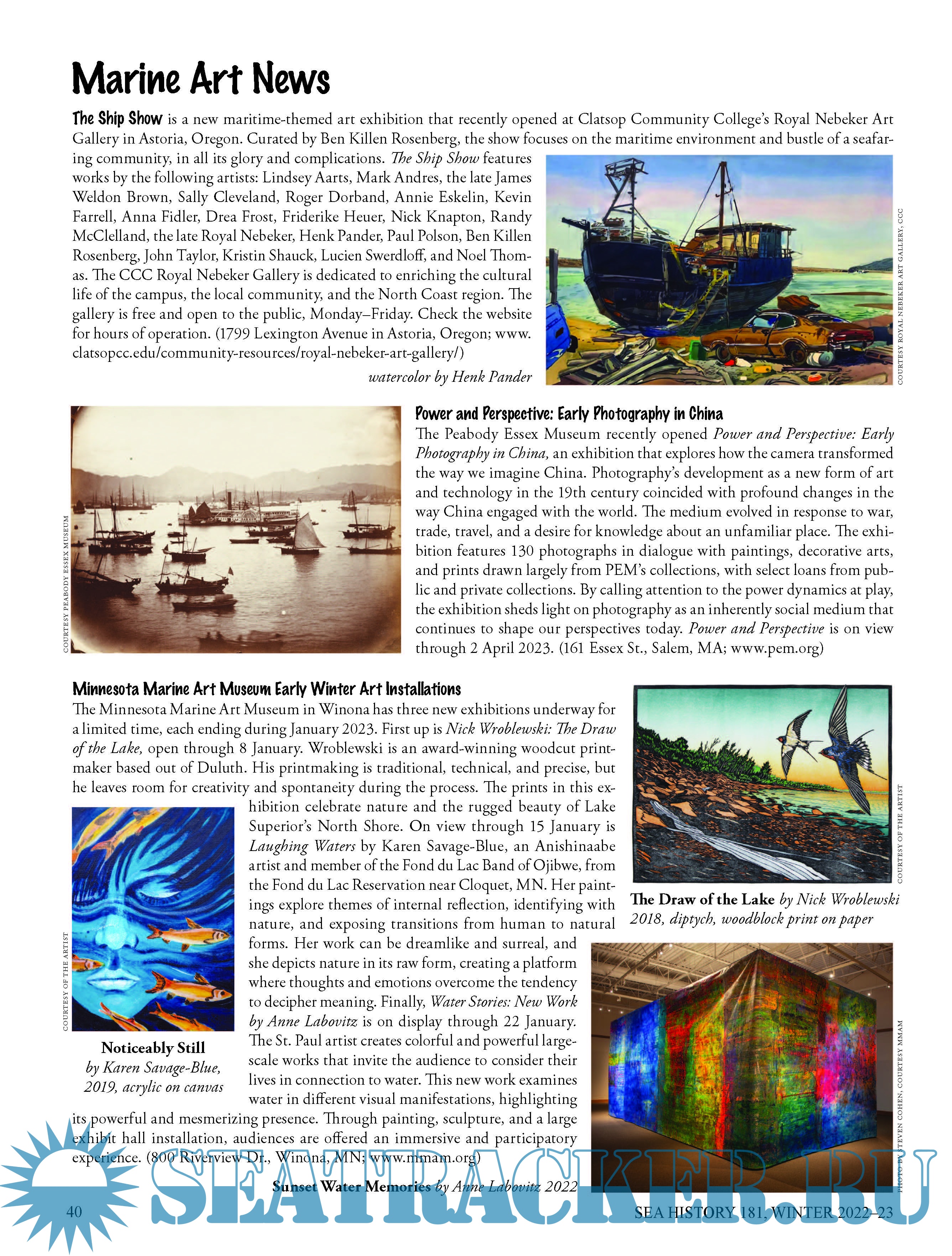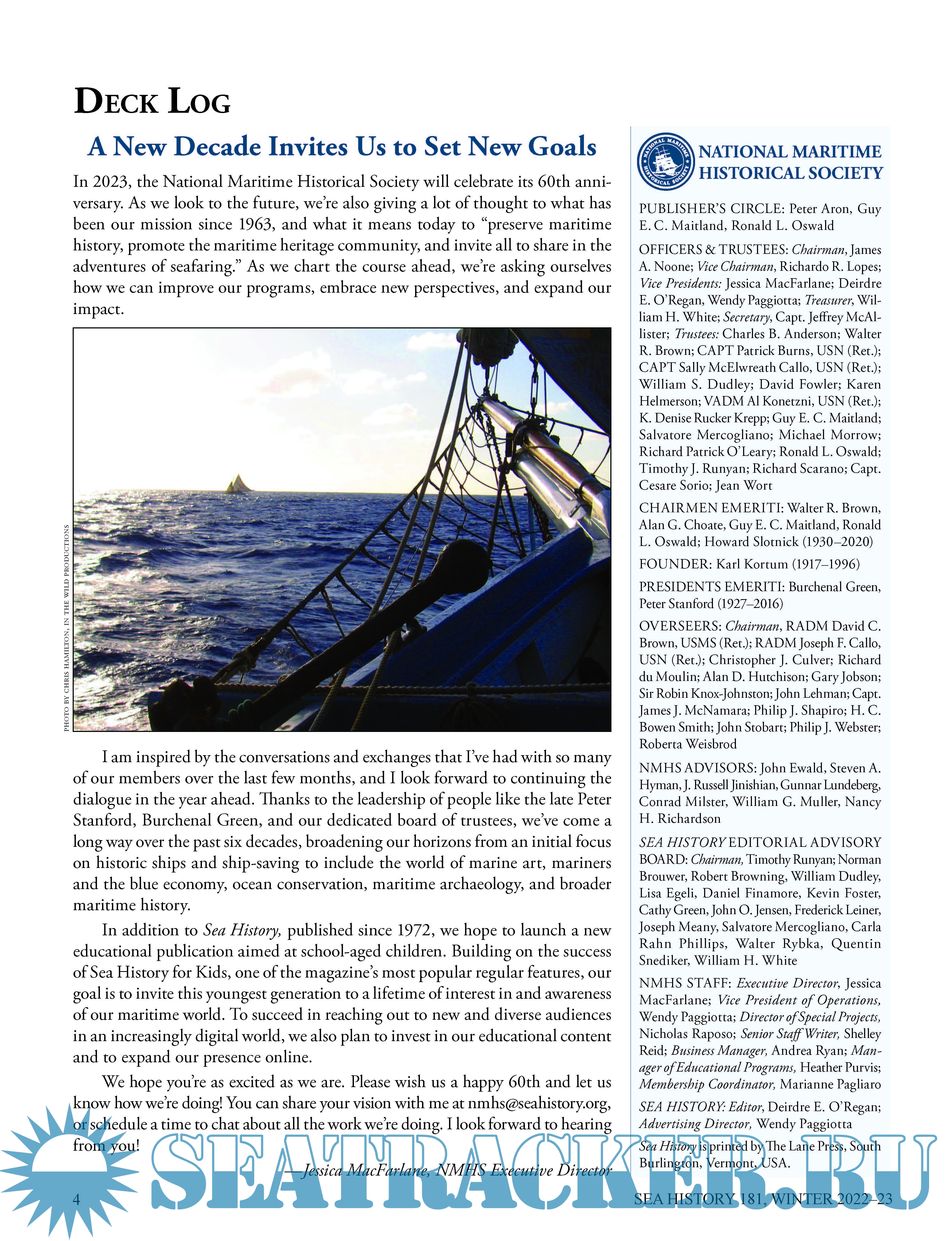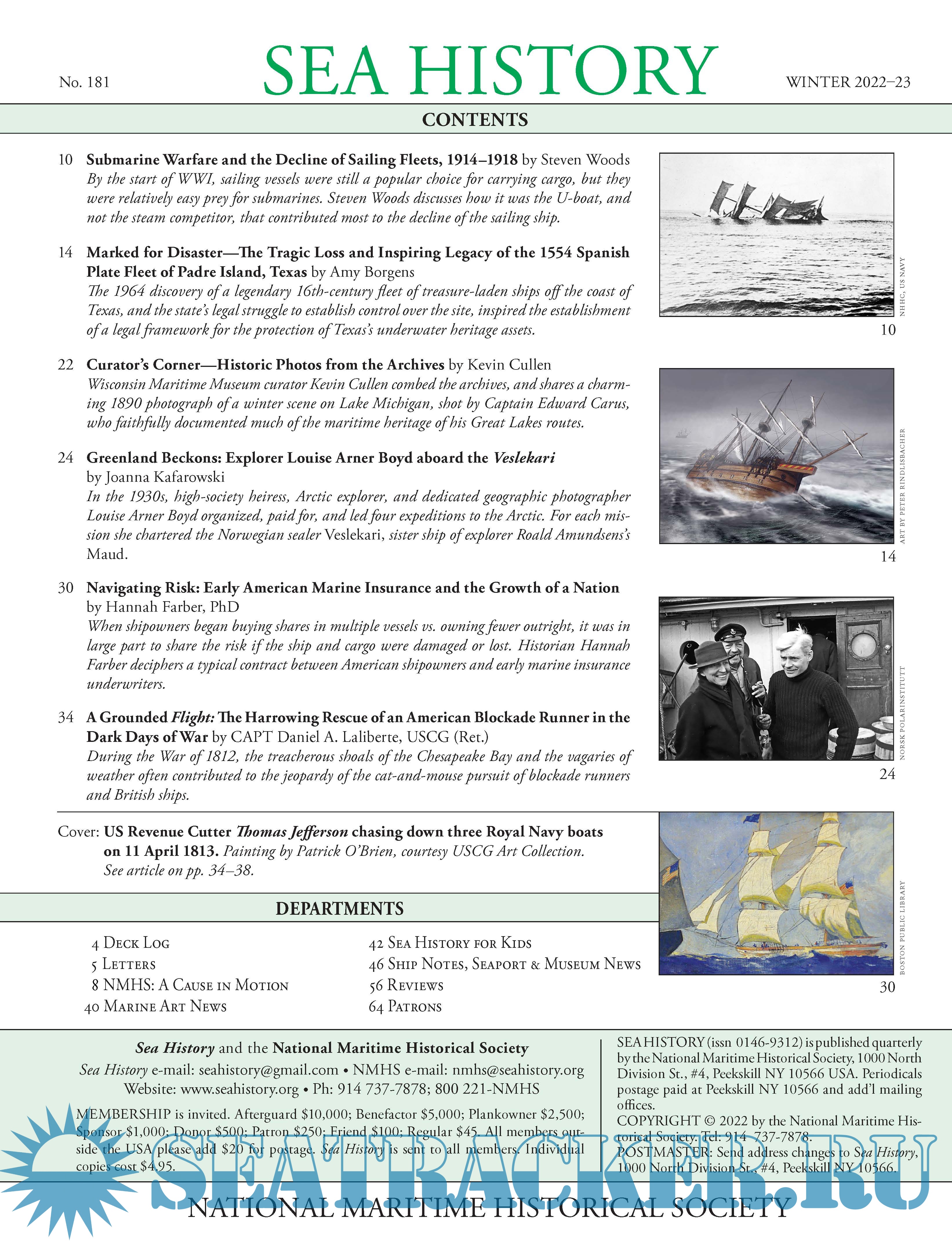 Our seafaring history comes alive in the pages of Sea History, the National Maritime Historical Society’s quarterly magazine. The pre-eminent journal of advocacy and education in our field, Sea History covers the world of maritime museums, sail training, key events and people in our maritime past, and the stories of everyday sailors past and present, and marine archaeology, with a national focus and an international scope, as well as these regular features:
