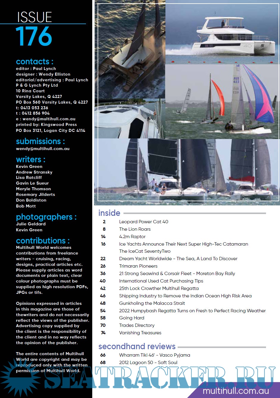 Year: 2023 Language: english Author: Paul Lynch Editor Genre: Periodical (magazine) Edition: January/February 2023 Format: PDF Quality: Photo of pages Pages count: 86 Description: Multihull World is an Australian-based specialist publication devoted to multihull enthusiasts - catamarans and trimarans, offshore, off-the-beach, power, racing and cruising.