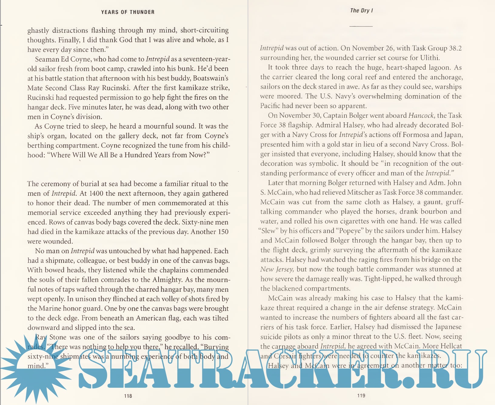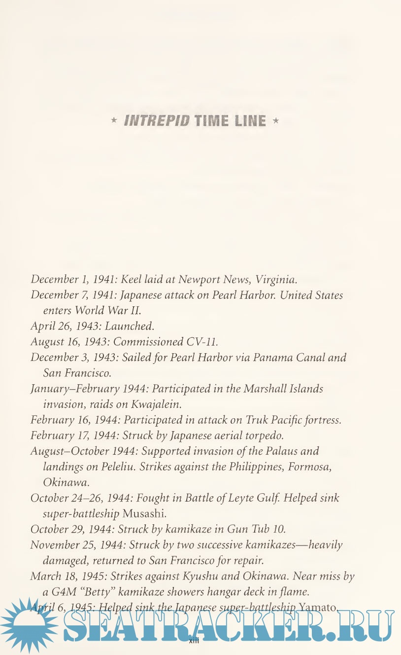 In a riveting narrative based on archival research and interviews with surviving crewmen, authors Bill White and Robert Gandt take us inside the war in the Pacific. We join Intrepid’s airmen at the Battle of Leyte Gulf, in October 1944, as they gaze in awe at the apparitions beneath them: five Japanese battleships, including the dreadnoughts Yamato and Musashi, plus a fleet of heavily armored cruisers and destroyers. The sky fills with multitude bursts of anti-aircraft fire. The flak, a Helldiver pilot would write in his action report, “was so thick you could get out and walk on it.” Half a dozen Intrepid aircraft are blown from the sky, but they sink the Musashi. A few months later, off Okinawa, they again meet her sister ship, the mighty Yamato. In a two-hour tableau of hellfire and towering explosions, Intrepid’s warplanes help send the super-battleship and 3,000 Japanese crewmen to the bottom of the sea.