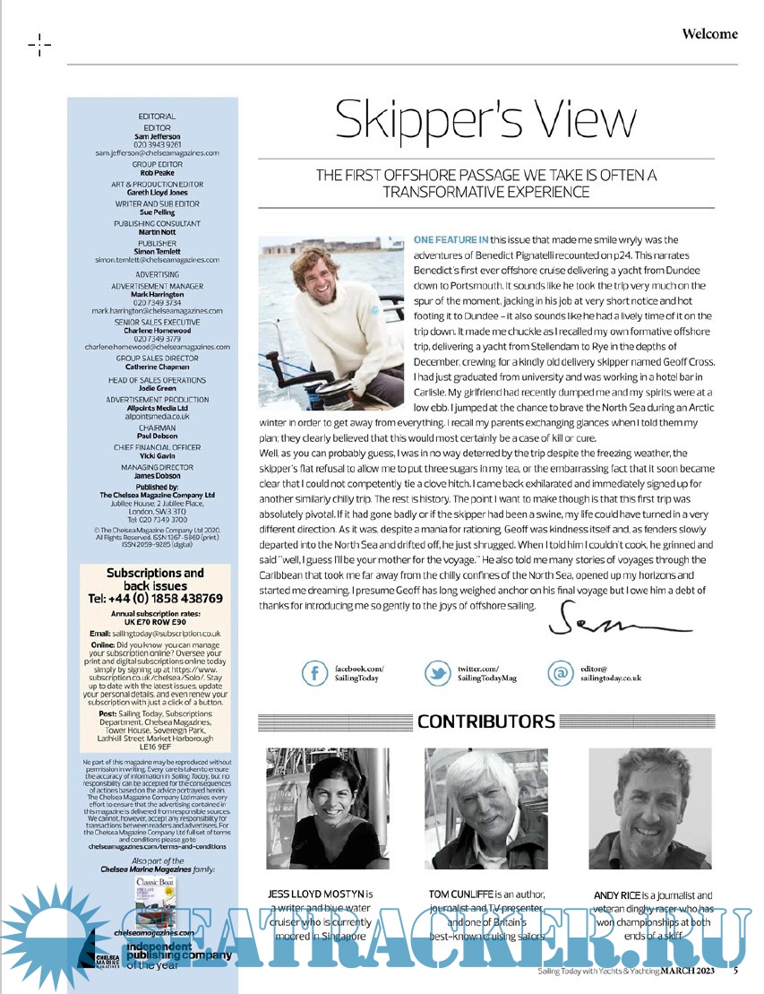 Year: 2023 Language: English Author: (Editor) Sam Jefferson Genre: Periodical (magazine) Publisher: The Chelsea Magazine Company ltd. Edition: March 2023 Format: PDF Quality: eBook Pages count: 100 Description: Sailing Today is the magazine for hands-on cruising sailors whose love of sailing takes them around the British Isles, across the Channel and further, to the blue waters of the wider world.Offering a wealth of practical advice and a dynamic mix of in-depth boat, gear and equipment news, Sailing Today is written cover to cover by sailors, for sailors. Since its launch in 1997, the magazine has sealed its reputation for essential sailing information and advice.Since we launched in 1997 we have sealed our reputation as THE magazine for essential sailing information and expert advice.ST is written by sailors for sailors, from our new and used boat tests, to our step by step practical articles and in-depth gear tests, or our inspiring cruising tales from home and abroad.Whatever you want to know – from which GPS to buy, or the best way to install central heating – Sailing Today provides the best answers.With our fantastic on-board gear tests, the latest boat tests and regular advice about seamanship and navigation, we deliver practical back-up for those who enjoy using their boats and want to get the best from them.
