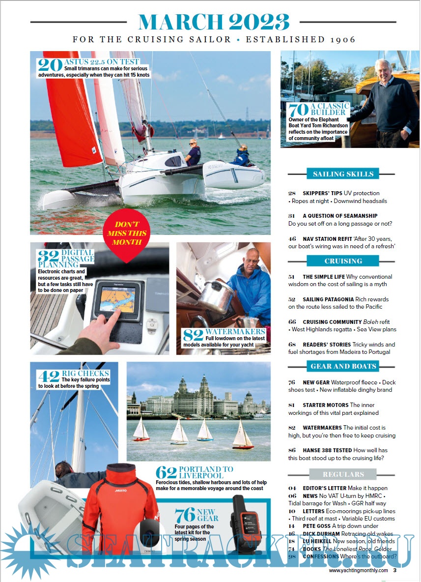 Year: 2023 Language: English Author: Theo Stocker (Editor) Genre: Periodical (magazine) Publisher: Future Publishing Limited Edition: March 2023 Format: PDF Quality: eBook Pages count: 100 Description: Yachting Monthly is at the heart of the British yachting market and is for people who actively sail their boats – whether cruising across the channel, around the coast or further afield in blue waters.It provides an entertaining mix of vital information for cruising yachtsmen with all levels of experience, which maximises their enjoyment, increases their skills and gives them the confidence to broaden their horizons.