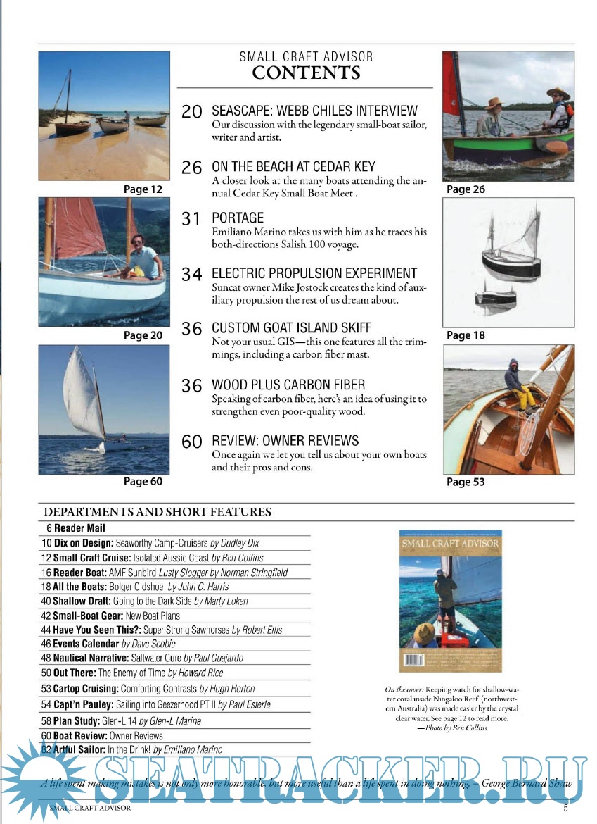 Description: Small boats, big adventure! The only magazine focused on small and trailerable sailboats, cruising, and adventure. Each issue features places to sail, how-to and modification articles, a plan study for the boat builder, and a feature-length review of a production sailboat.