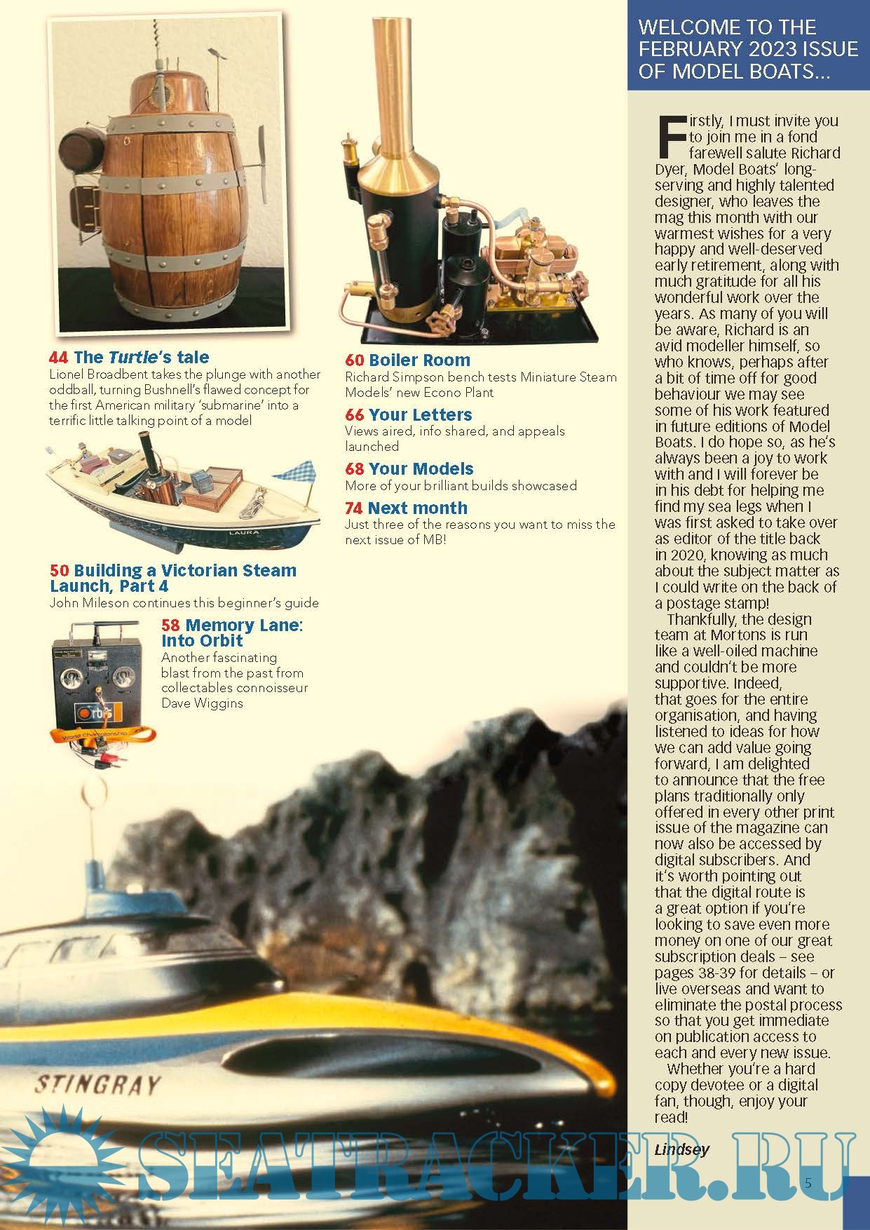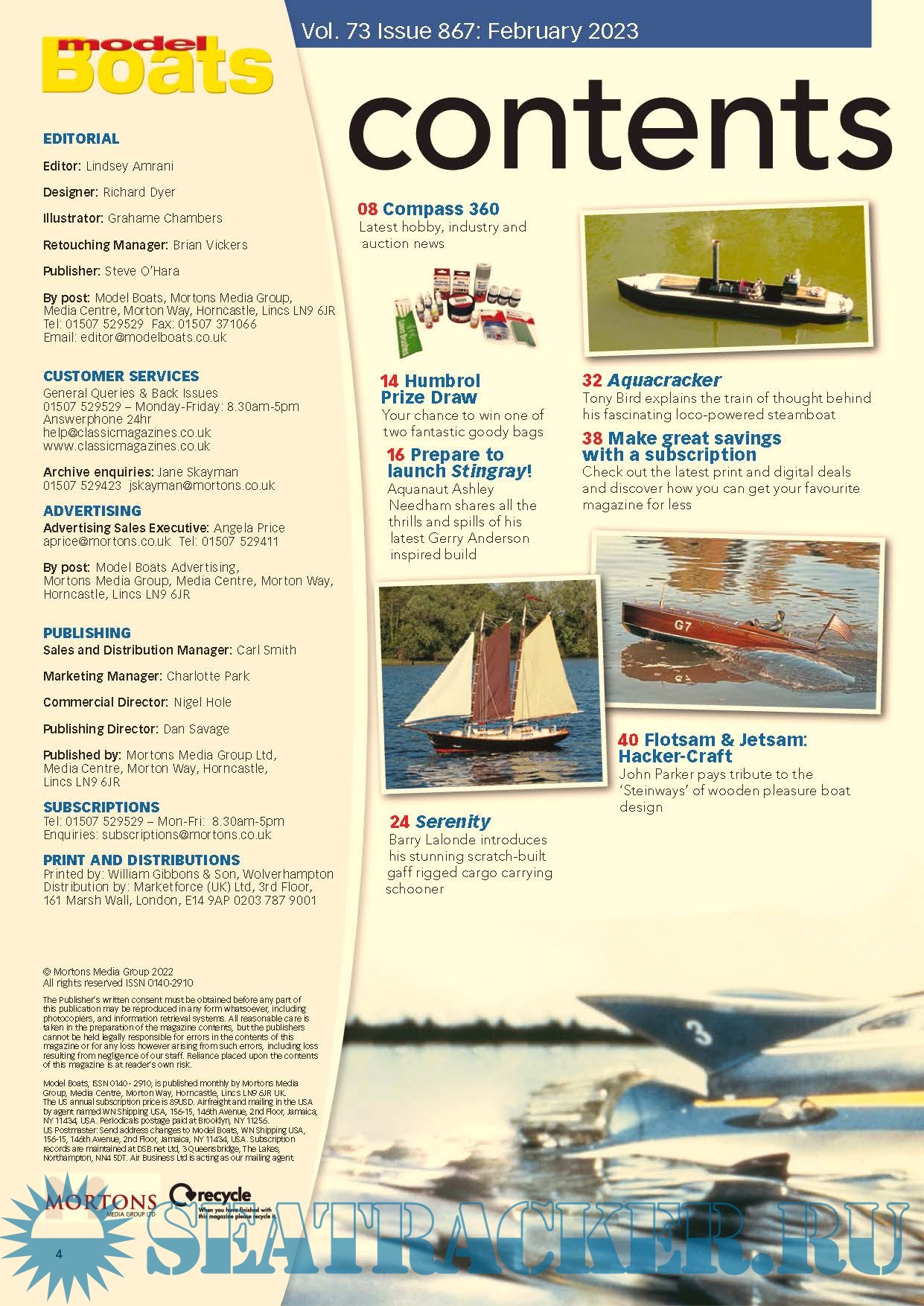 Year: 2023 Language: english Author: MyTimeMedi Ltd. Genre: Periodical (magazine) Format: PDF Quality: eBook Pages count: 76 Description: Model Boats magazine is a practical and informative read for those with a love for the hobby. It covers the latest news and views from the various clubs and associations around the country, useful hints, tips and step by step guides for those interested in the art of constructing a model boat as well as tests and recommendations of new boats and tools. Floating along behind these are great special features examining in depth different models from narrowboat to destroyer! Issue February, 2023 Volume 73 No. 867