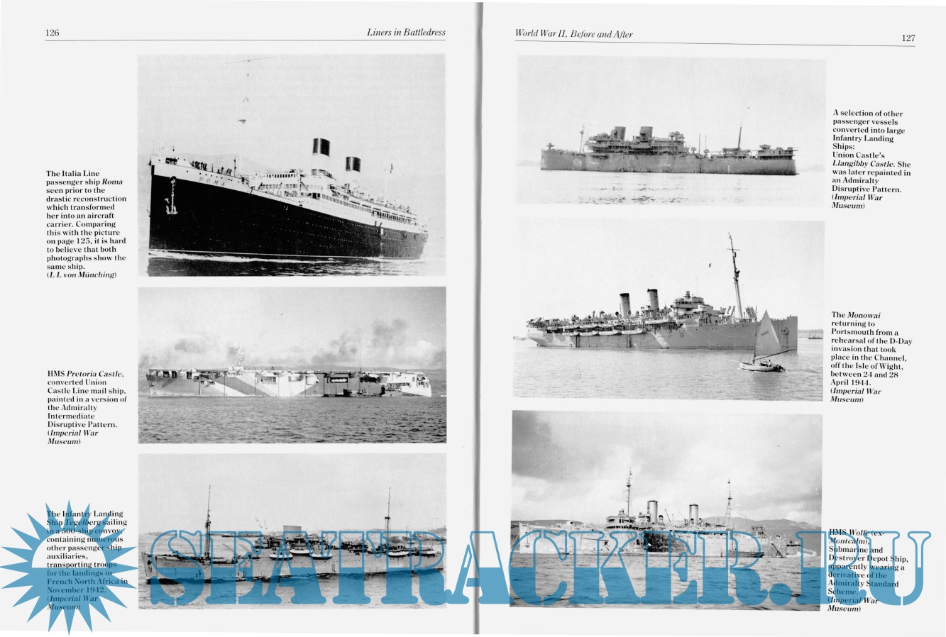 Year: 1989 Language: English Author: David Williams Genre: History Publisher: Vanwell Publishing Limited Format: PDF Quality: Scanned pages Number of pages: 81 Description: FROM VIRTUALLY the beginning of the age of steam at sea, merchant passenger vessels have been appropriated during times of war to perform auxiliary duties in support of armed forces. In this work they have served their countries' needs throughout these periods of adversity as dutifully and successfully as they served those of international trade and travel in more halcyon times. Indeed, ocean passenger ships have proved to be so suitable for emergency work, with their vast and readily adaptable accommodation spaces and high speeds, often superior to Contemporary warships, that in wartime they have been converted to serve in many very different capacities - as troopships, auxiliary cruisers, hospital ships, commerce raiders, accommodation ships and aircraft carriers, as well as in a number of even more specialised roles.