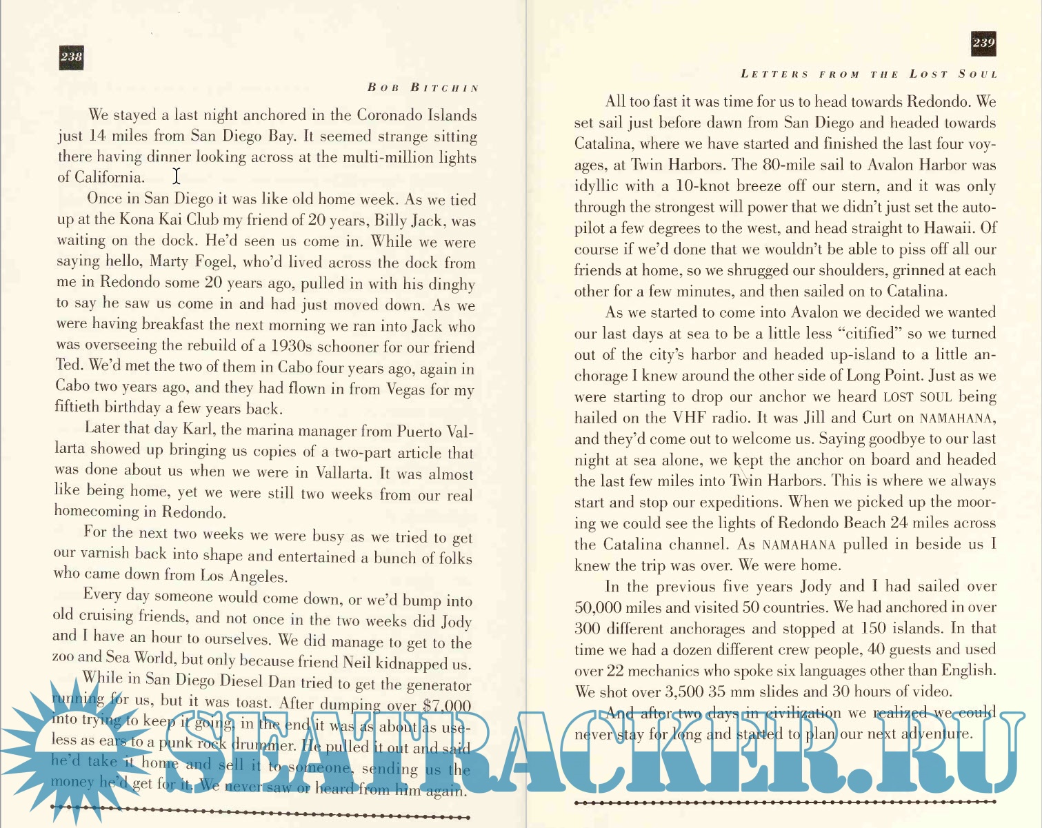 Description: Attitude is the only difference between an ordeal and an adventure. That's the adage Bob Bitchin lives by as he ventures across the Pacific and Atlantic Oceans in his 1981 Formosa 56, the LOST SOUL. Highlighting five years and 45,000 miles in a compact, analogy-laden book, Bob takes the reader from California to French Polynesia and back in a mere 83 pages; followed by another 51 pages of cruising down the West Coast and through the Caribbean on to the Azores; and then he squeezes in the Mediterranean and return passages, back to California, in the final 100 pages. ― Good Old Boat