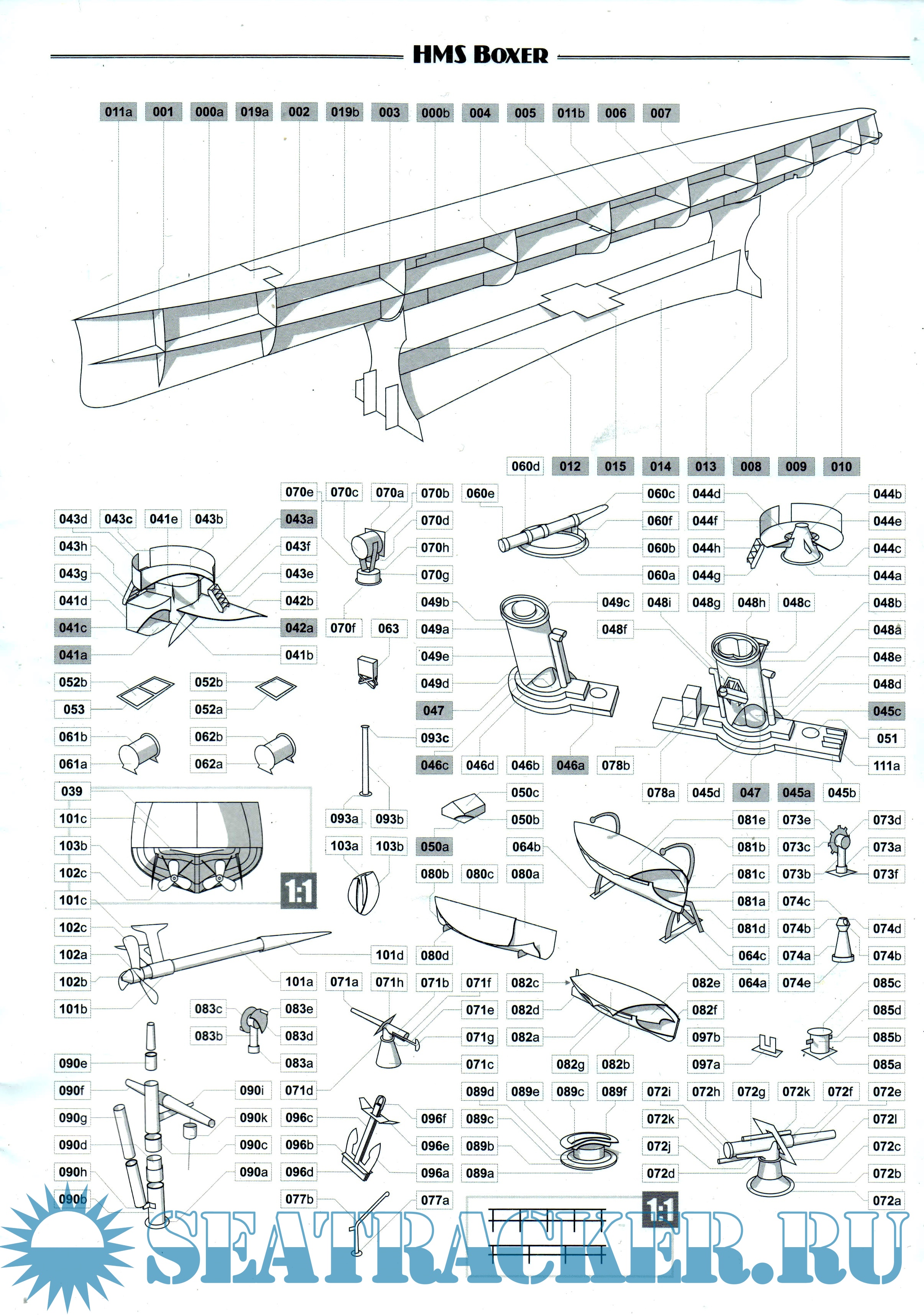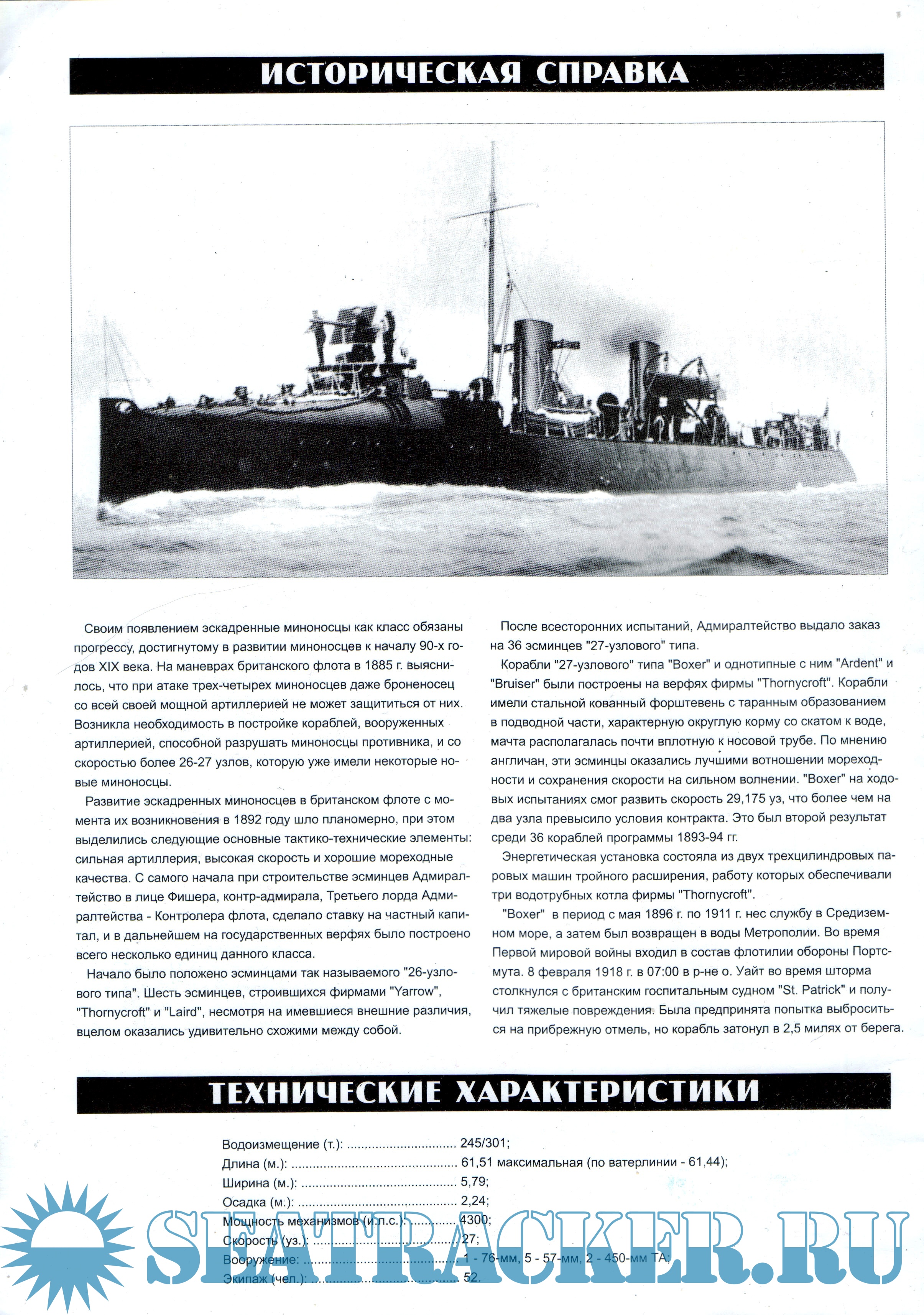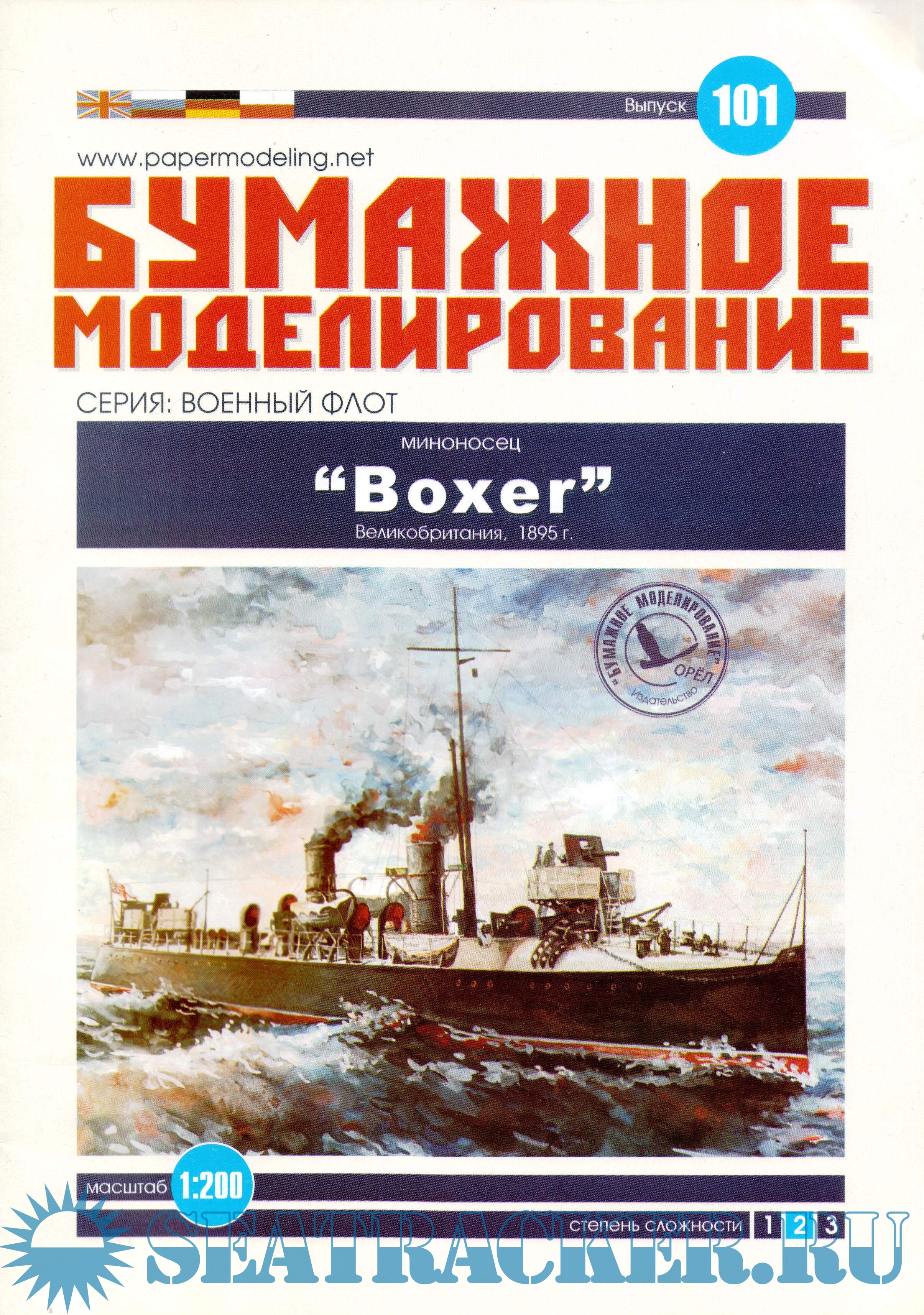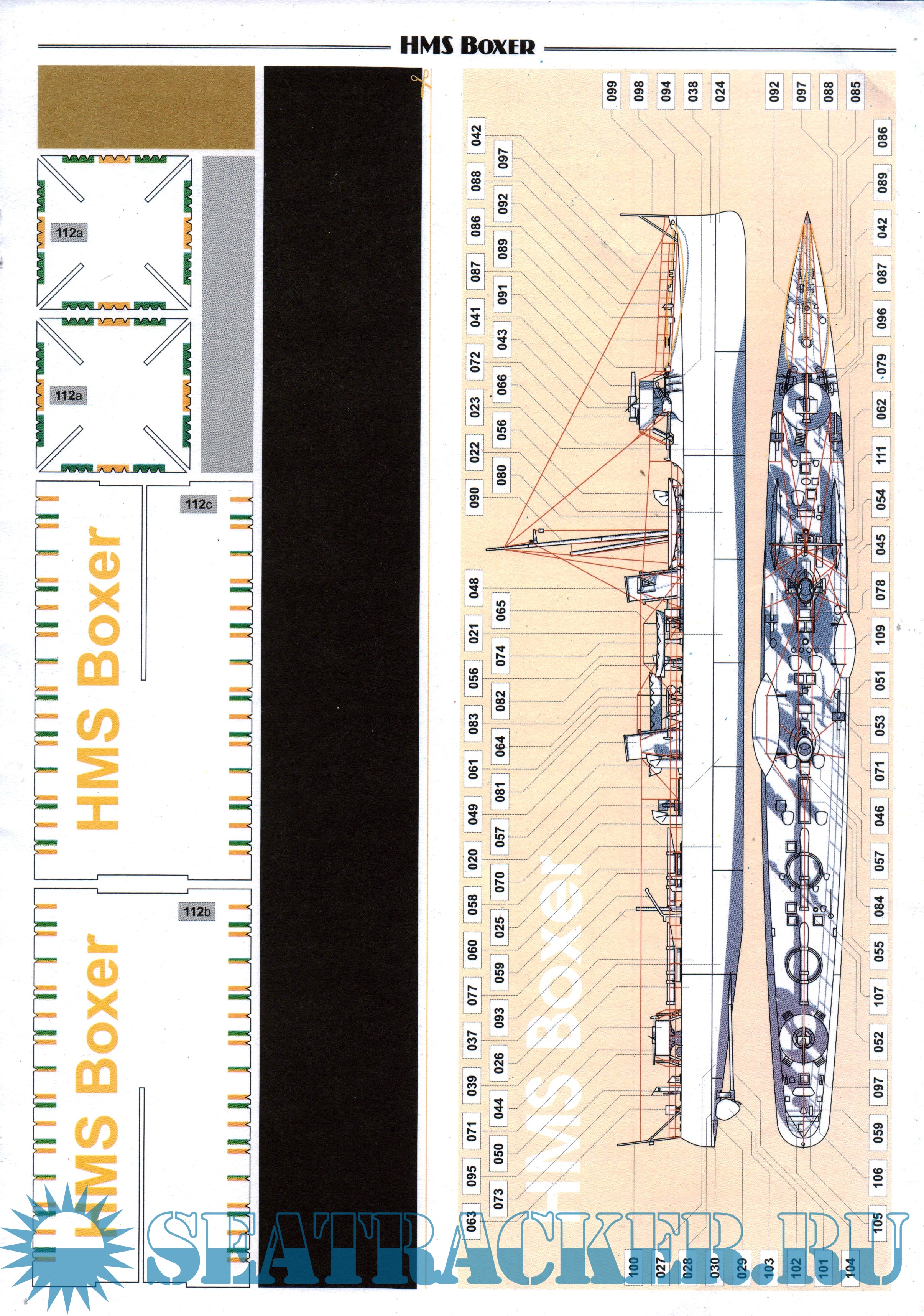 16 листов формата А4 цветных выкроек для создания модели миноносца "Boxer" по состоянию на 1895 год в масштабе 1:100. Инструкция на русском, английском, немецком и польском языках.