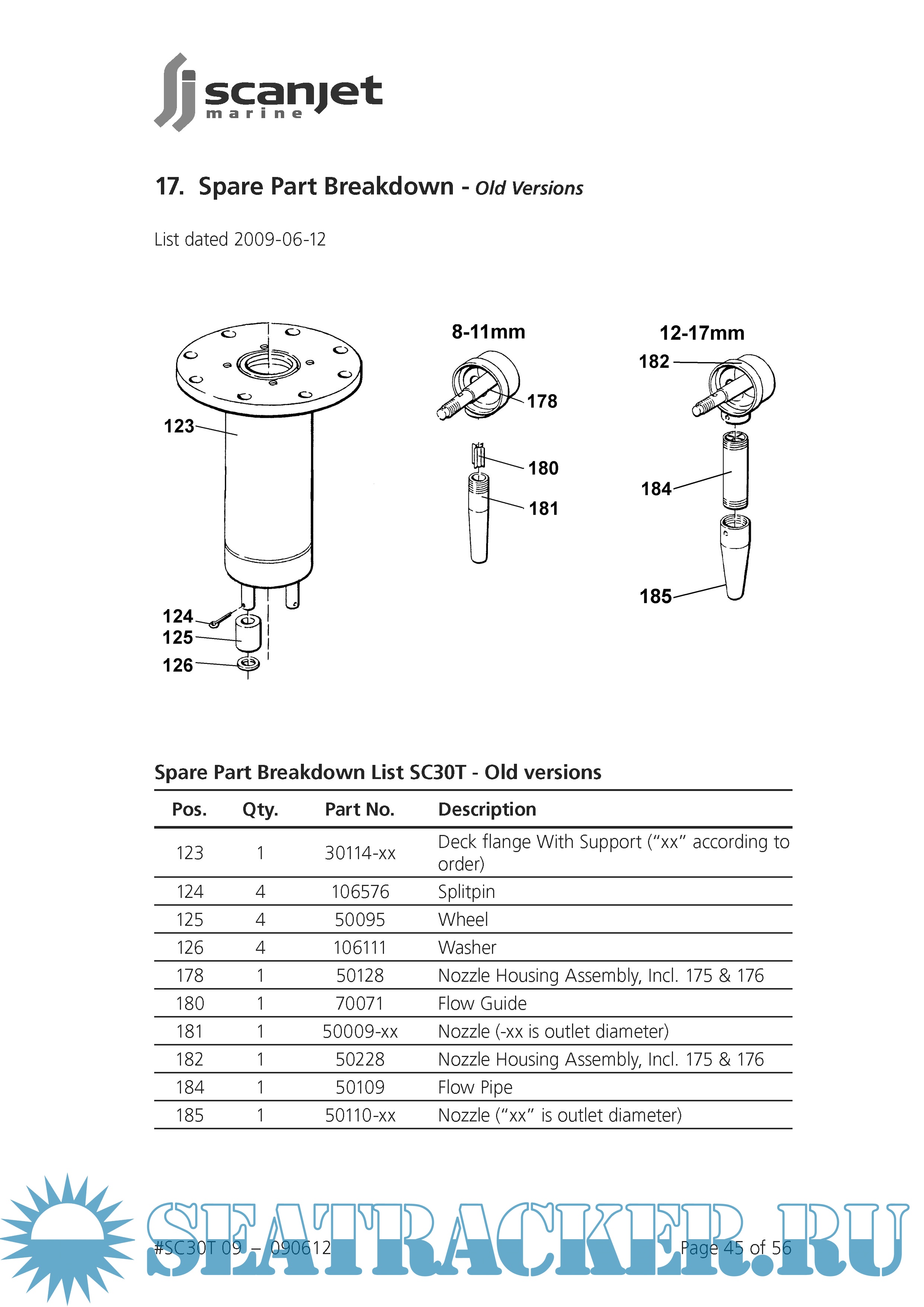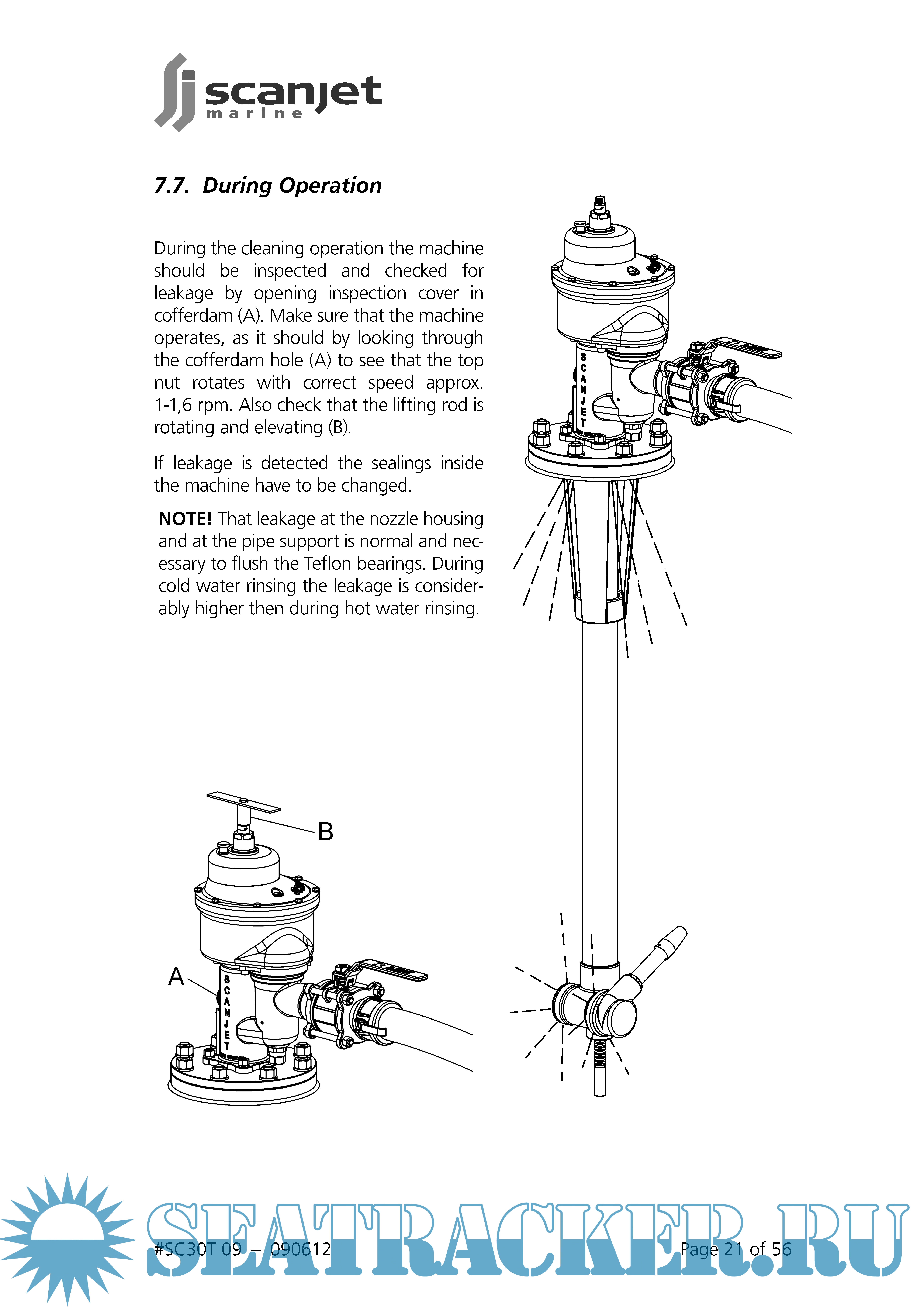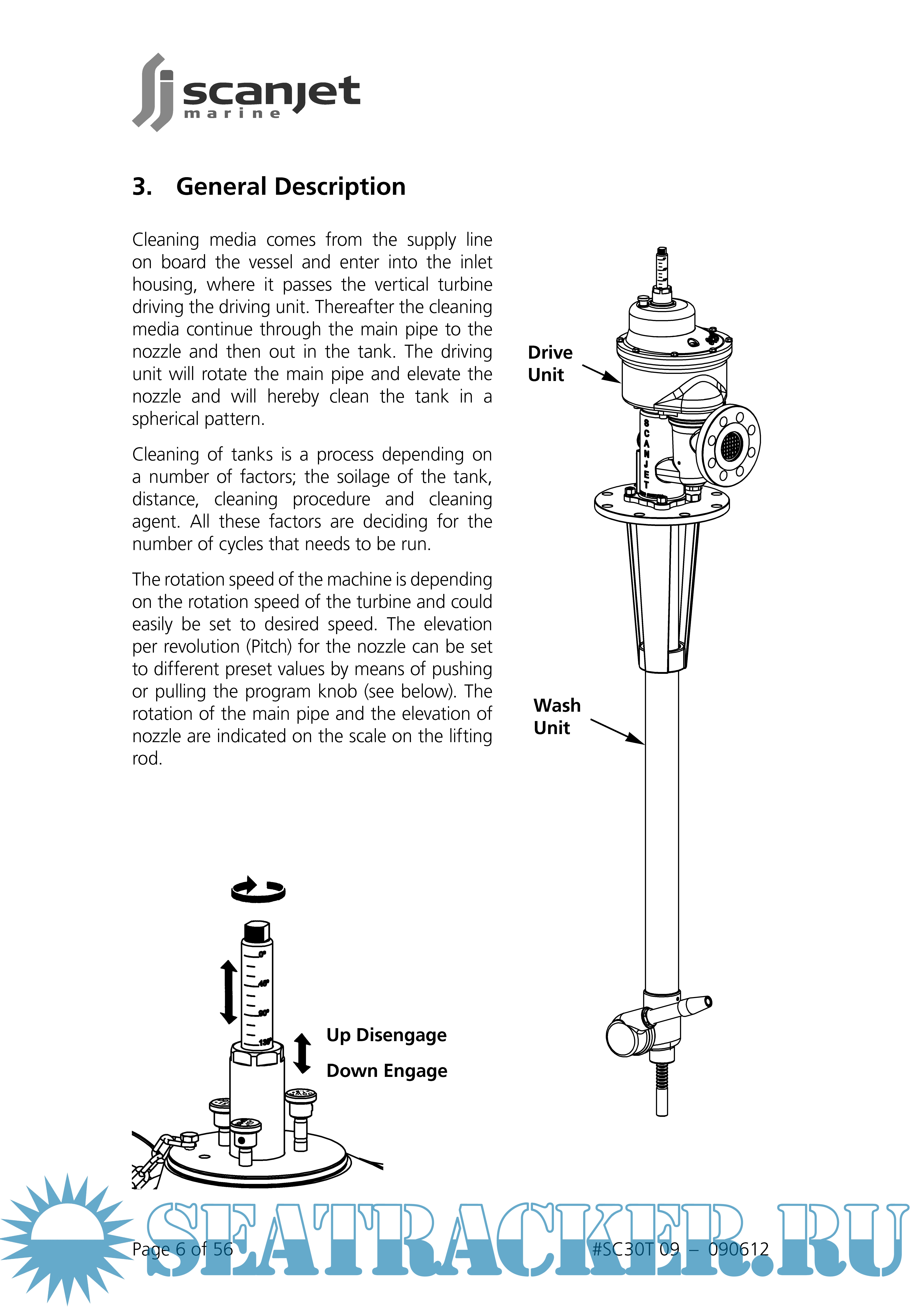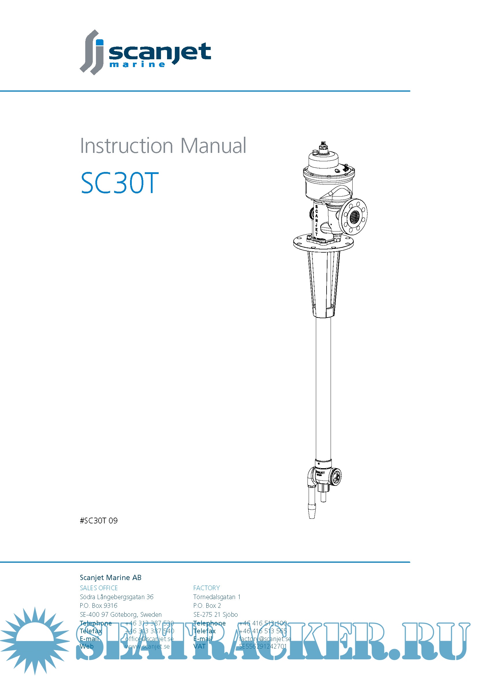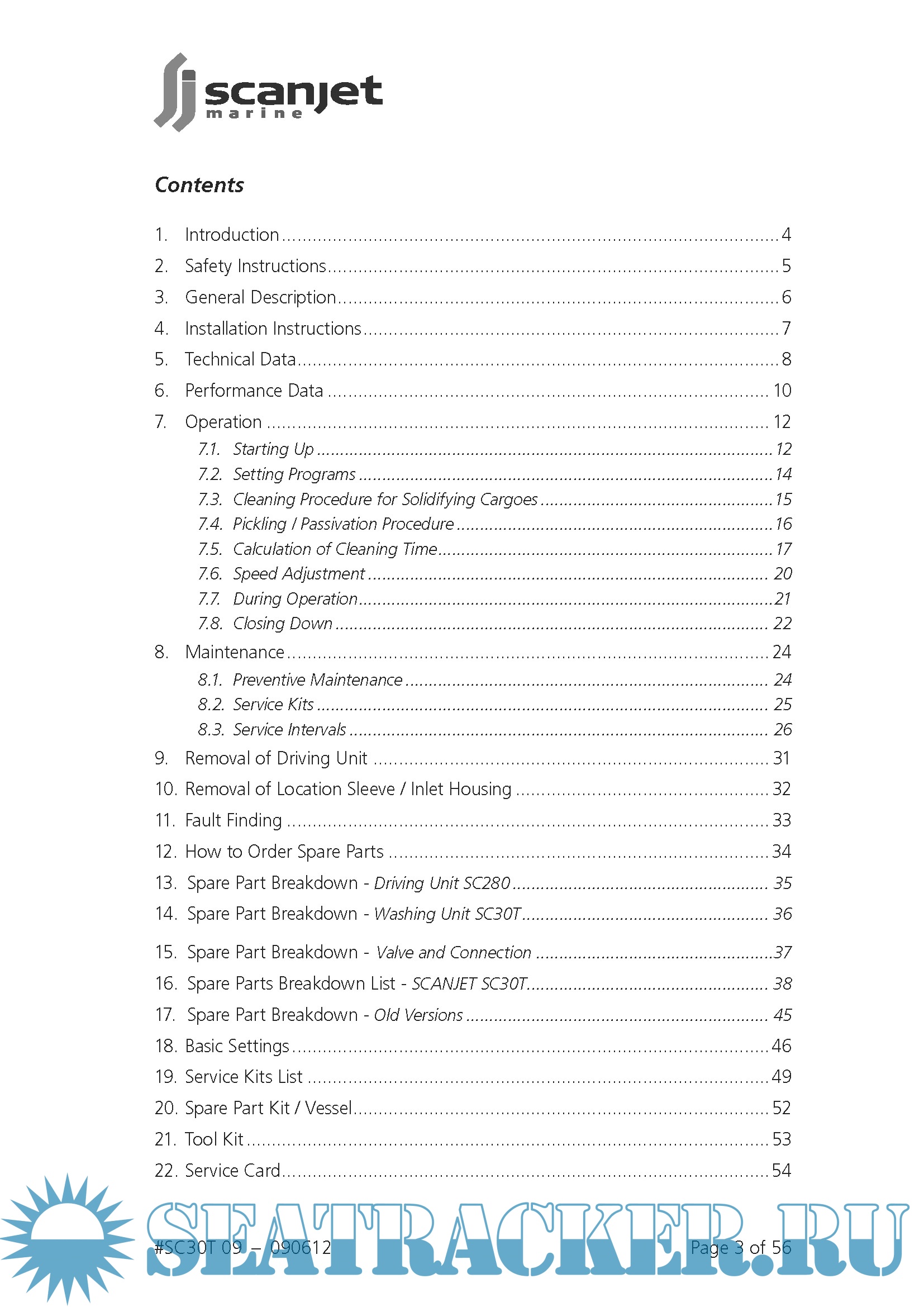 Year: 2009 Language: english Author: www.scanjet.se Genre: Manual Format: PDF Quality: eBook Pages count: 56 Description: SCANJET model SC30T is a tank cleaning machine specially developed for cleaning of cargo and slop tanks on board chemical/product carriers. The size, construction and cleaning requirements of these tanks are design criteria, which have been evaluated prior to installation in your vessel. SC30T tank cleaning machine consists of two main parts; a washing unit that is fixed installed in deck and a turbine driven drive unit. The cleaning procedure will start by opening the valve for cleaning media. The drive unit will now turn the main pipe and lift the nozzle creating a horizontal spiral-cleaning pattern. When the cleaning procedure is finalized the valve is to be closed. This manual has been prepared as a guide for the persons who will be operating and maintaining your tank cleaning machine. The key for long life for your tank cleaning machine will always be a system of carefully planned maintenance. Your tank cleaning machine is actually doing a rough and dirty job for you. Keep up the maintenance and the Scanjet SC30T will keep servicing you for many years.