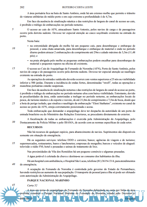 Purpose – The purpose of the Roteiro da Costa do Brasil is to complement Brazilian nautical charts – never to describe them – giving sailors subsidies that allow them to better evaluate the information on the charts, when navigating along the coast or channels and at landings, as well as how to know the regulations, resources and port and terminal facilities.
