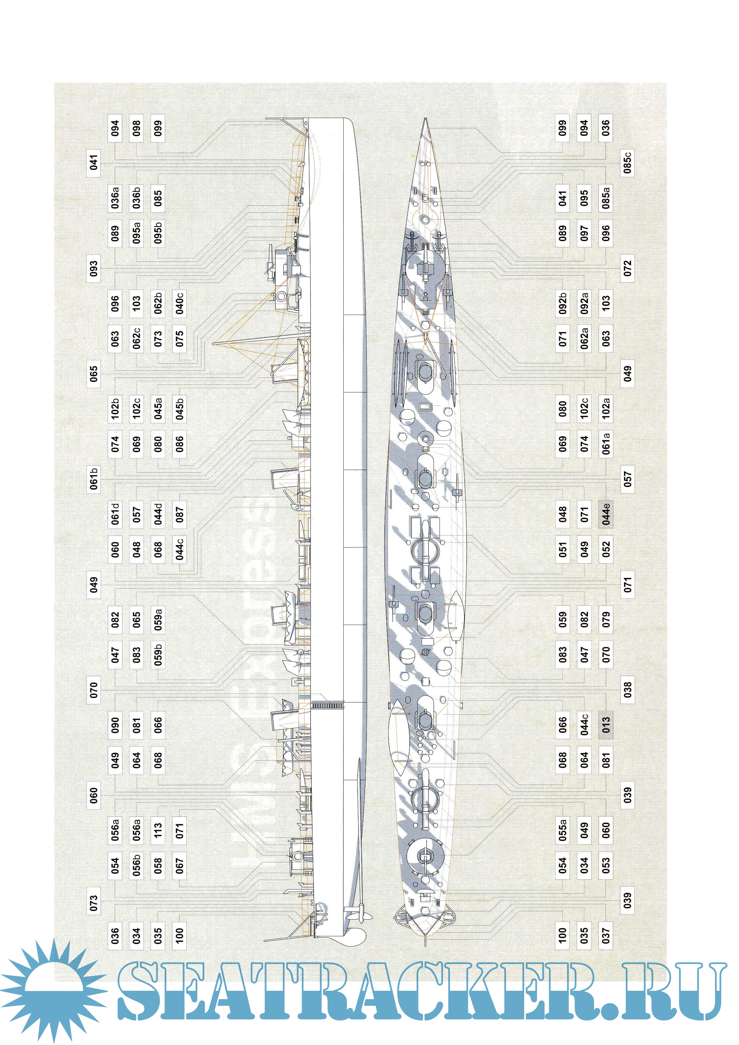 14 листов формата А4 цветных выкроек для создания модели миноносца "Express" по состоянию на 1902 год в масштабе 1:200. Инструкция на русском, английском, немецком и польском языках.