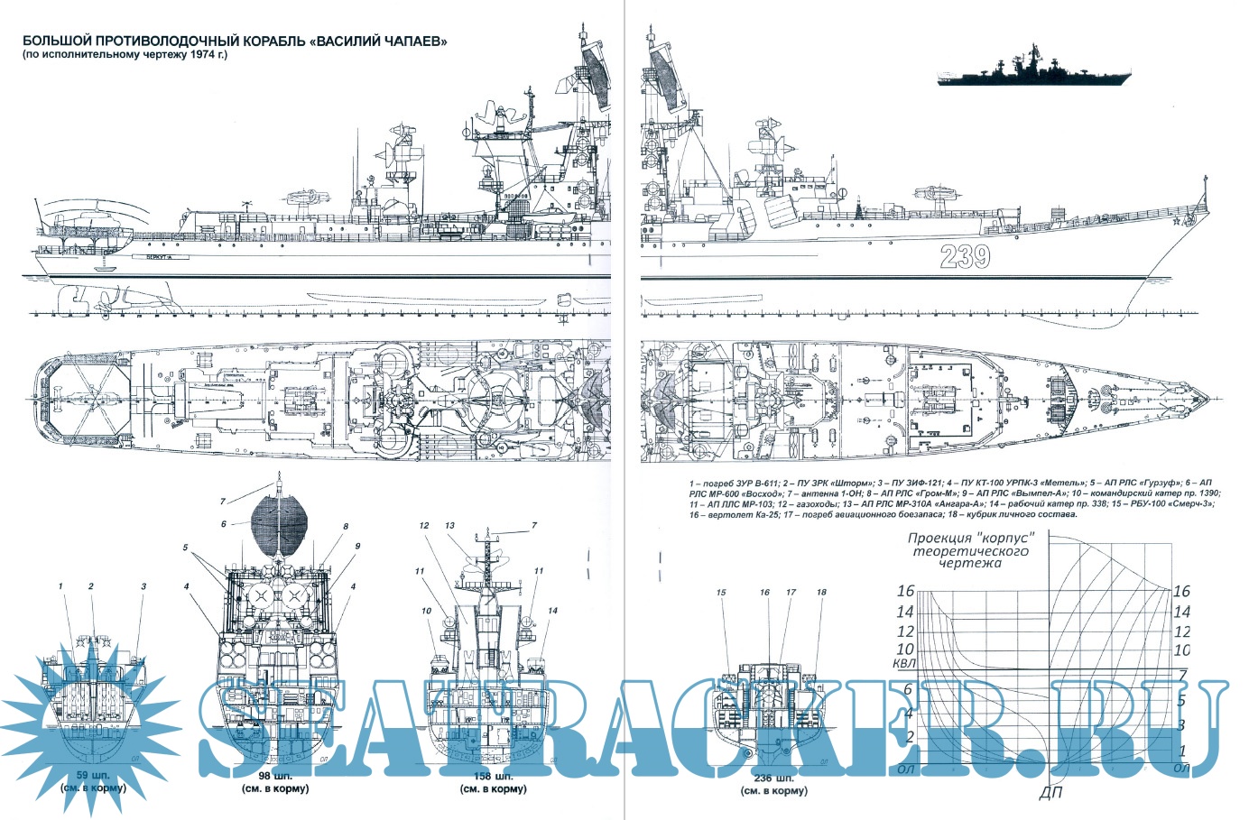 Описание: Архитектурный тип корабля аналогичен пр. 1134 - длиннопалубный, с умеренно развитыми надстройками. Особенностью формы корпуса является наличие носового бульбового обтекателя, в котором размещено антенное устройство гидроакустической станции. Корабль имел одну мачту башенного типа, где размещались почти все основные антенные посты радиоэлектронного вооружения.