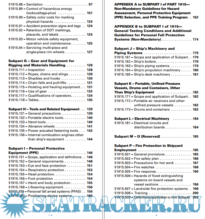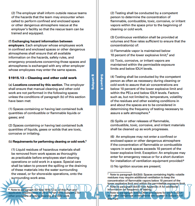 This booklet contains all the safety and health standards specific to the Shipyard Industry contained in Title 29 Code of Federal Regulations (CFR) Part 1915, as of July 1, 2014. Also included are brief discussions of the following:1. The importance of regular employee training to establish and reinforce employee awareness in the areas of job safety and health.2. The elements of a safety and health program that can be used by employers to develop effective programs at their work sites.A brief description of the OSHA Consultation Program, which is available to assist employers, is also included at the end of this publication.It is not a standard or regulation, and it creates no new legal obligations. It contains recommendations as well as descriptions of mandatory safety and health standards. The recommendations are advisory in nature, informational in content, and are intended to assist employers in providing a safe and healthful workplace. The Occupational Safety and Health Act (OSH Act) requires employers to comply with safety and health standards and regulations promulgated by OSHA or by a state with an OSHA-approved state plan.