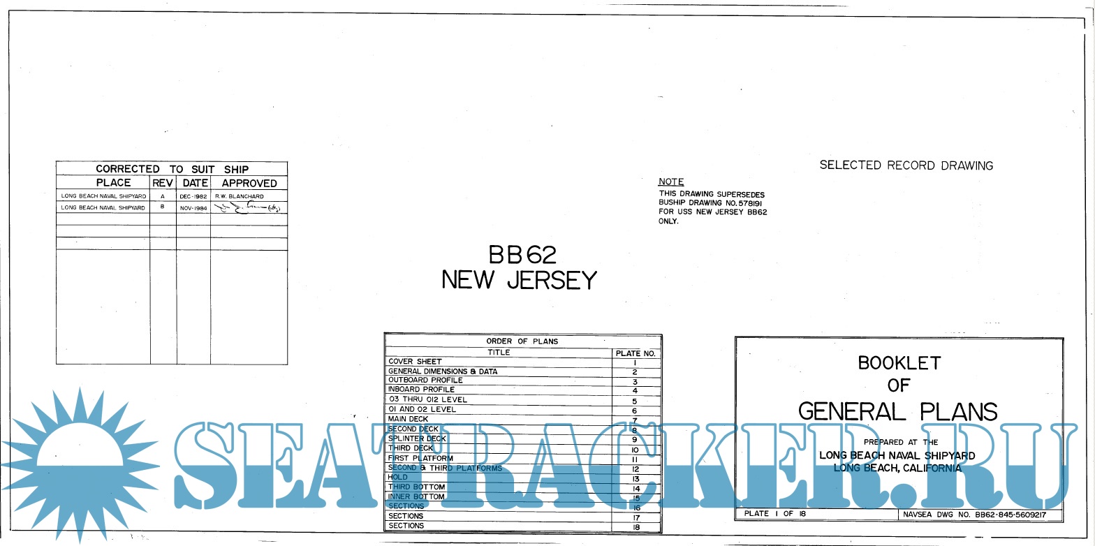 Year: 1984 Language: english Author: Long Beach Naval Shipyard Genre: Other Publisher: Long Beach Naval Shipyard Format: PDF Quality: Scanned pages Pages count: 18 Description: 18 sheets of working drawings of the battleship USS New Jersey (BB62)