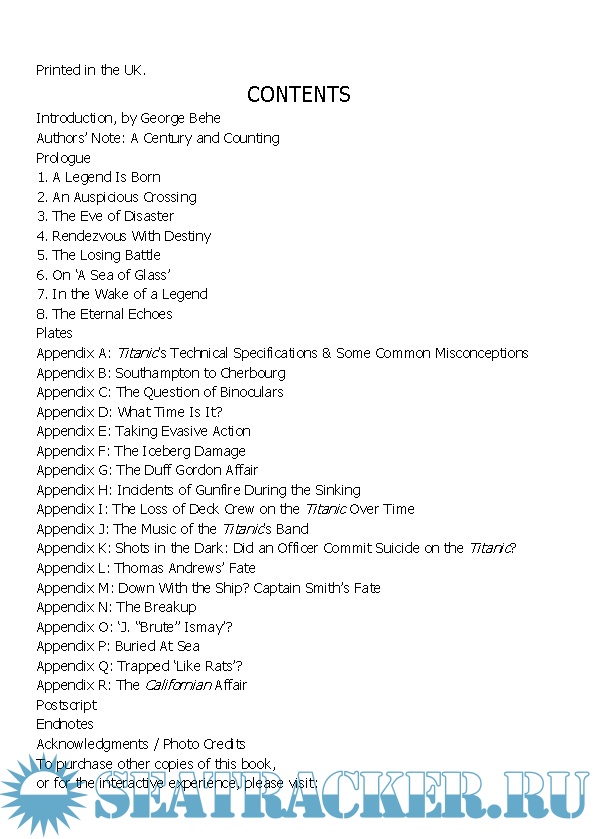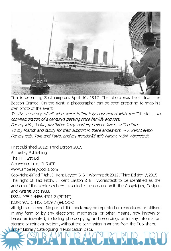 Year: 2015 Language: english Author: Tad Fitch, J. Kent Layton & Bill Warmstedt Genre: History Publisher: Amberley Publishing Format: EPUB Quality: eBook Pages count: 1095 Description: On the night of 14/15 April 1912, a brandnew, supposedly unsinkable ship, the largest and most luxurious vessel in the world at the time, collided with an iceberg and sank on her maiden voyage. Of the 2,208 people on board, only 712 were saved. The rest either drowned or froze to death in the icy-cold waters of the North Atlantic. How could this ‘unsinkable’ vessel sink and why did so few of those aboard survive?The authors bring the tragedy to life, telling the story of the ship’s design, construction and maiden voyage. The stories of individuals who sailed on her, many previously known only as names on yellowing passenger and crew lists, are brought to light using rarely-seen accounts of the sinking. The stories of passengers of all classes and crewmembers alike, are explored. They tell the dramatic stories of lives lost and people saved, of the rescue ship Carpathia, and of the aftermath of the sinking. Never again would a large passenger liner sail without lifeboats for all.Despite the tragedy, the sinking of the Titanic indirectly led to untold numbers of lives being saved due to new regulations that came into force after the tragedy. Profusely illustrated, including many rare and unique views of the ship and those who sailed on her, this is as accurate and engrossing a telling of the life of the White Star Line’s Titanic and her sinking as you will read anywhere. Made special by the use of so many rare survivor accounts from the eye witnesses to that night to remember, the narrative places the reader in the middle of the maiden voyage, and brings the tragic sinking to life as never before. Additional info: Audio Book: https://seatracker.club/viewtop...?p=102315#102315