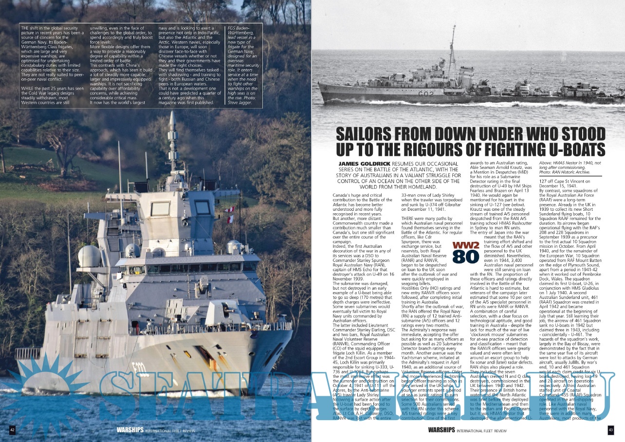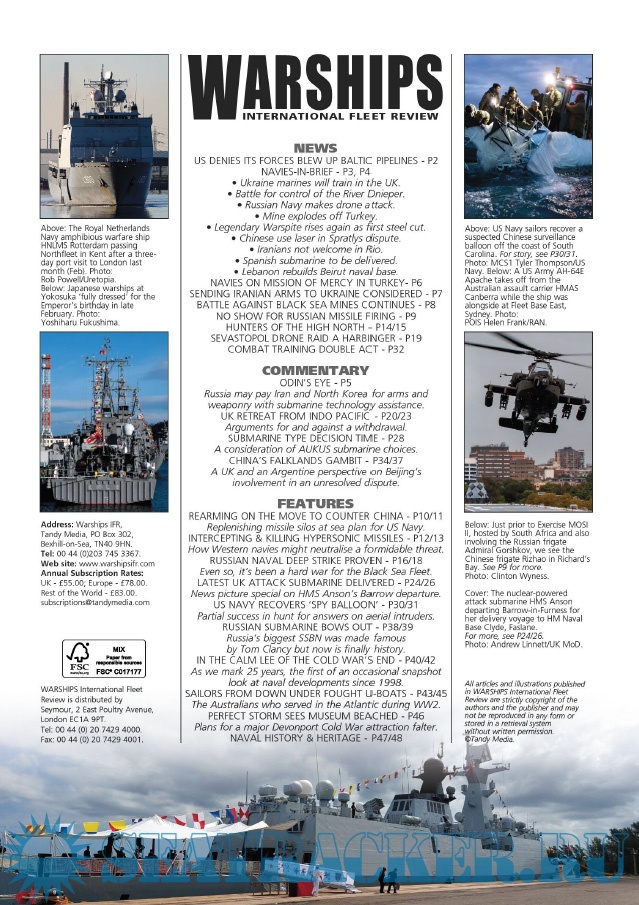 Description: Warships IFR puts the spotlight on the latest developments in the world’s navies. It covers current defence issues and has comments by leading analysts. The magazine regularly includes features on the Royal Navy and the US Navy in addition to incorporating news and features on all other navies across the globe. Warships IFR frequently carries in-depth articles on naval heritage.WARSHIPS International Fleet Review is published 12 times a year by Tandy Media Ltd who also publish Shipping Today & Yesterday (which provides news and features from the world of merchant shipping).