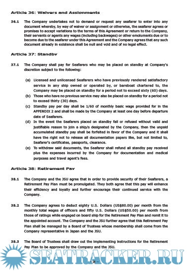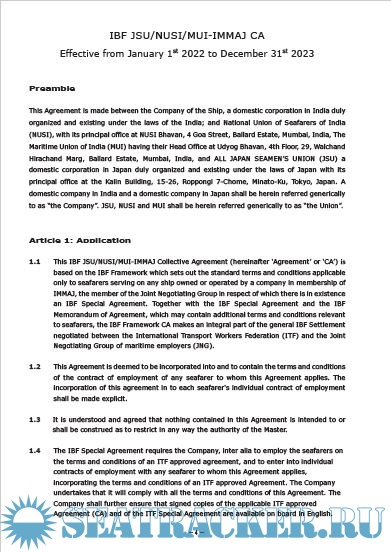 Description: This IBF JSU/NUSI/MUI-IMMAJ Collective Agreement (hereinafter ‘Agreement’ or ‘CA’) is based on the IBF Framework which sets out the standard terms and conditions applicable only to seafarers serving on any ship owned or operated by a company in membership of IMMAJ, the member of the Joint Negotiating Group in respect of which there is in existence an IBF Special Agreement.