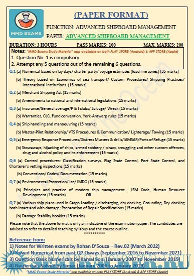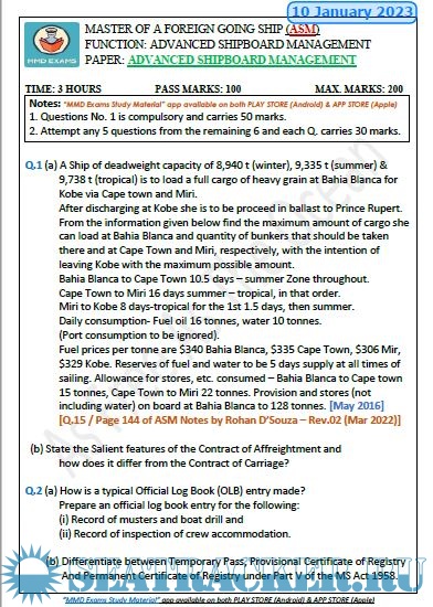 Question Paper Set for (ASM) Advanced Shipboard Management (March 2023) for Master's Examinations, Mercantile Marine Department (MMD), India