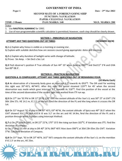 Question Paper Set (March 2023) for Second Mate (F.G.) Mercantile Marine Department (MMD), India Examinations