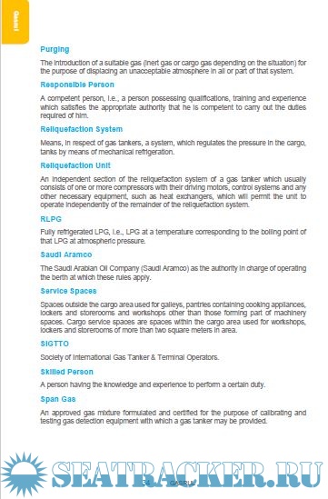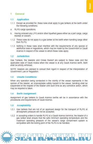 Saudi Aramco handles only Refrigerated Liquefied Petroleum Gases (RLPG) on the gas tankers to which these rules apply and whenever a gas tanker has dangerous substances other than RLPG on board and is accepted by Saudi Aramco for handling at the berth, their safe containment shall be in accordance with the requirements of internationally recognized Codes and Guides and such other authoritative sources of relevant information concerning the substances as may be appropriate.