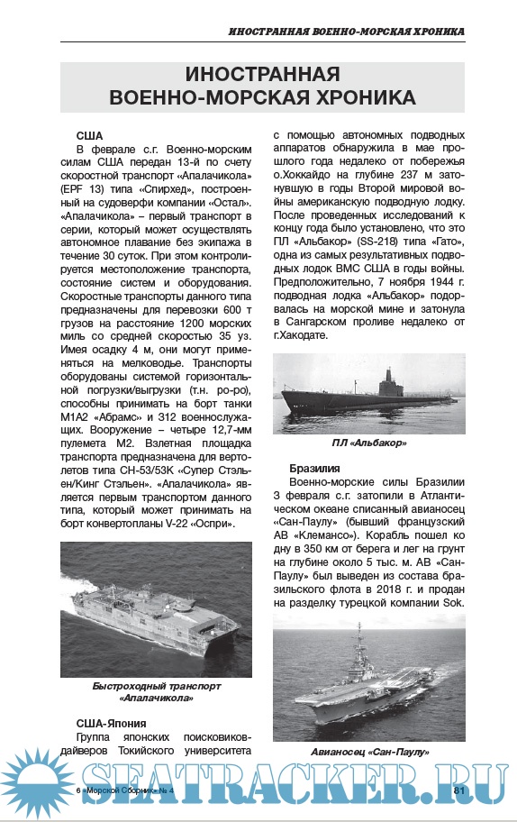 Год выпуска: 2023 Язык: русский Автор: Остапенко В.В. (Главный редактор) Жанр: Периодическое издание (журнал) Издание: 2023-04 Формат: PDF Качество: Изначально компьютерное (eBook) Количество страниц: 108 Описание: «Морской сборник» – официальный ежемесячный журнал Военно-Морского Флота России. Он выходит в свет уже более 160 лет без перерыва на войны или революции. Российские моряки с гордостью говорят, что сегодня у флота России есть две настоящие реликвии – это крейсер «Аврора» и легендарный журнал «Морской сборник».