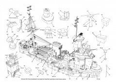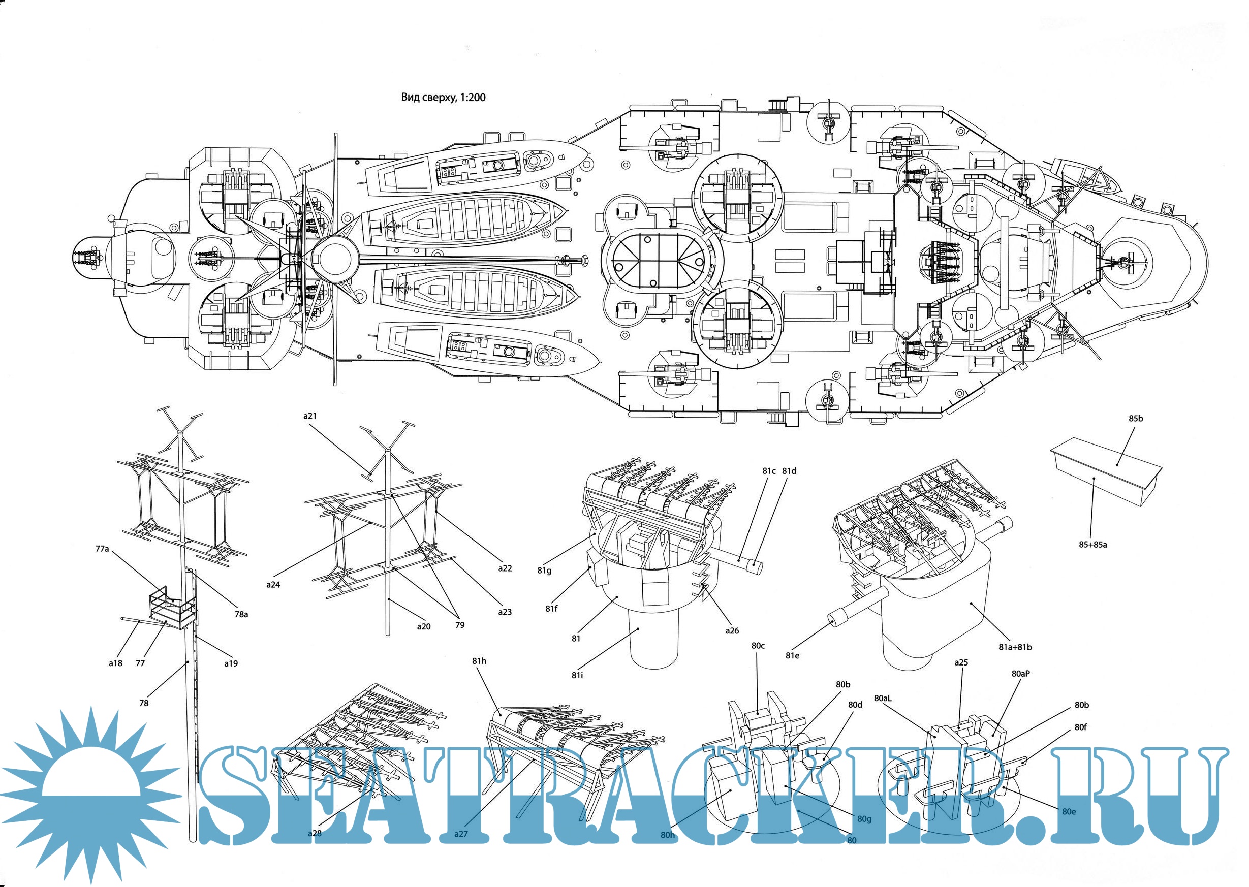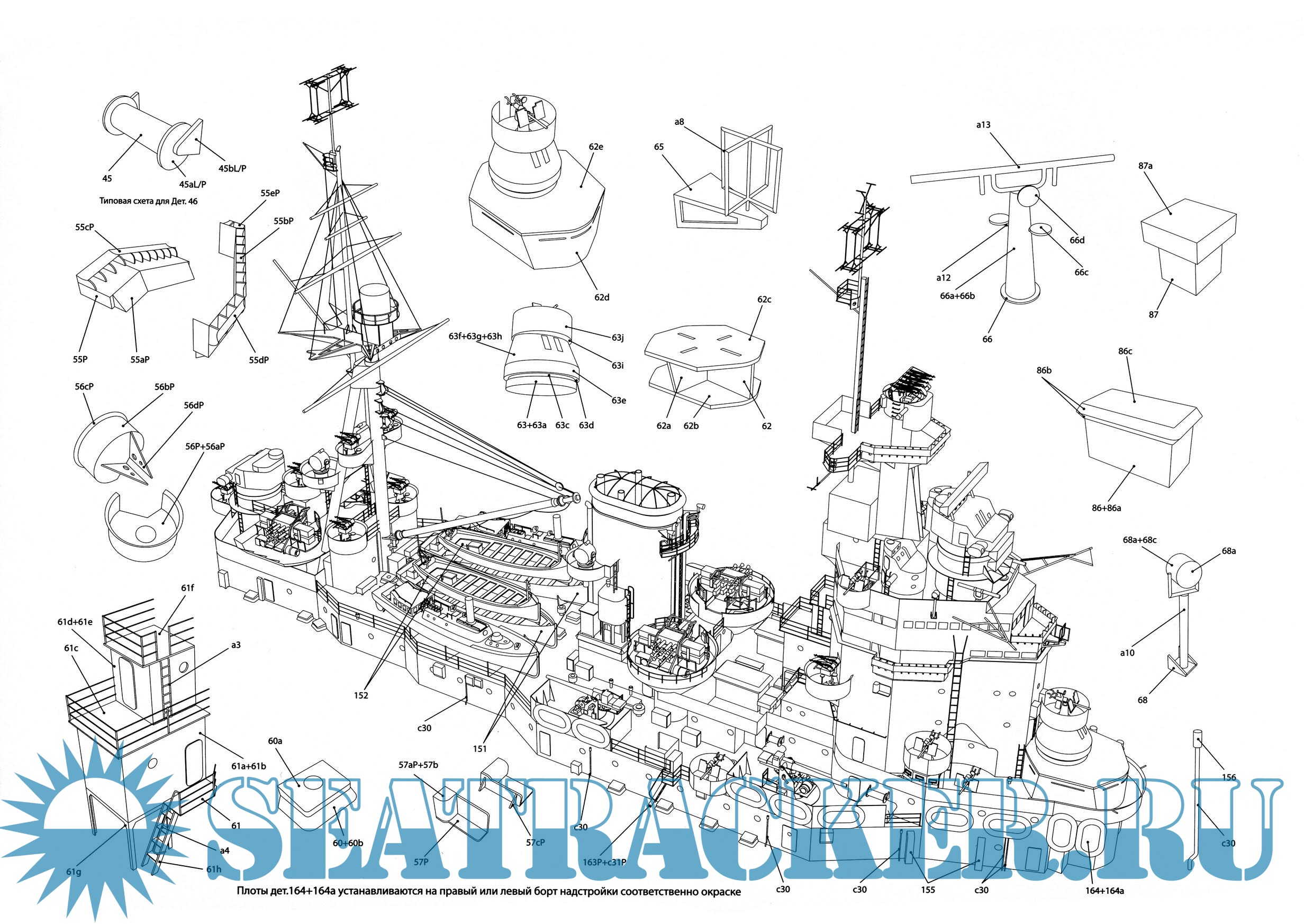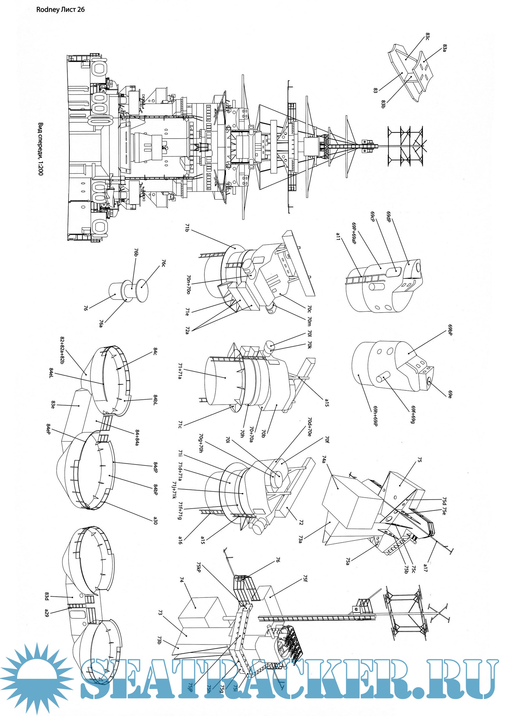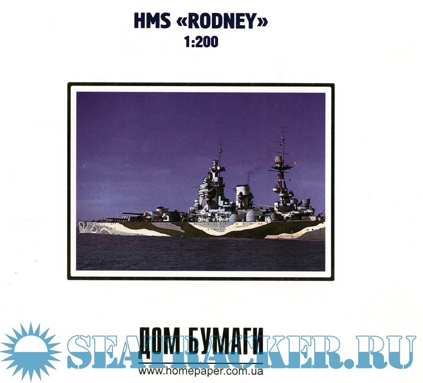53 листа цветных выкроек и инструкций для изготовления бумажной модели линкора HMS RODNEY в масштабе 1:200