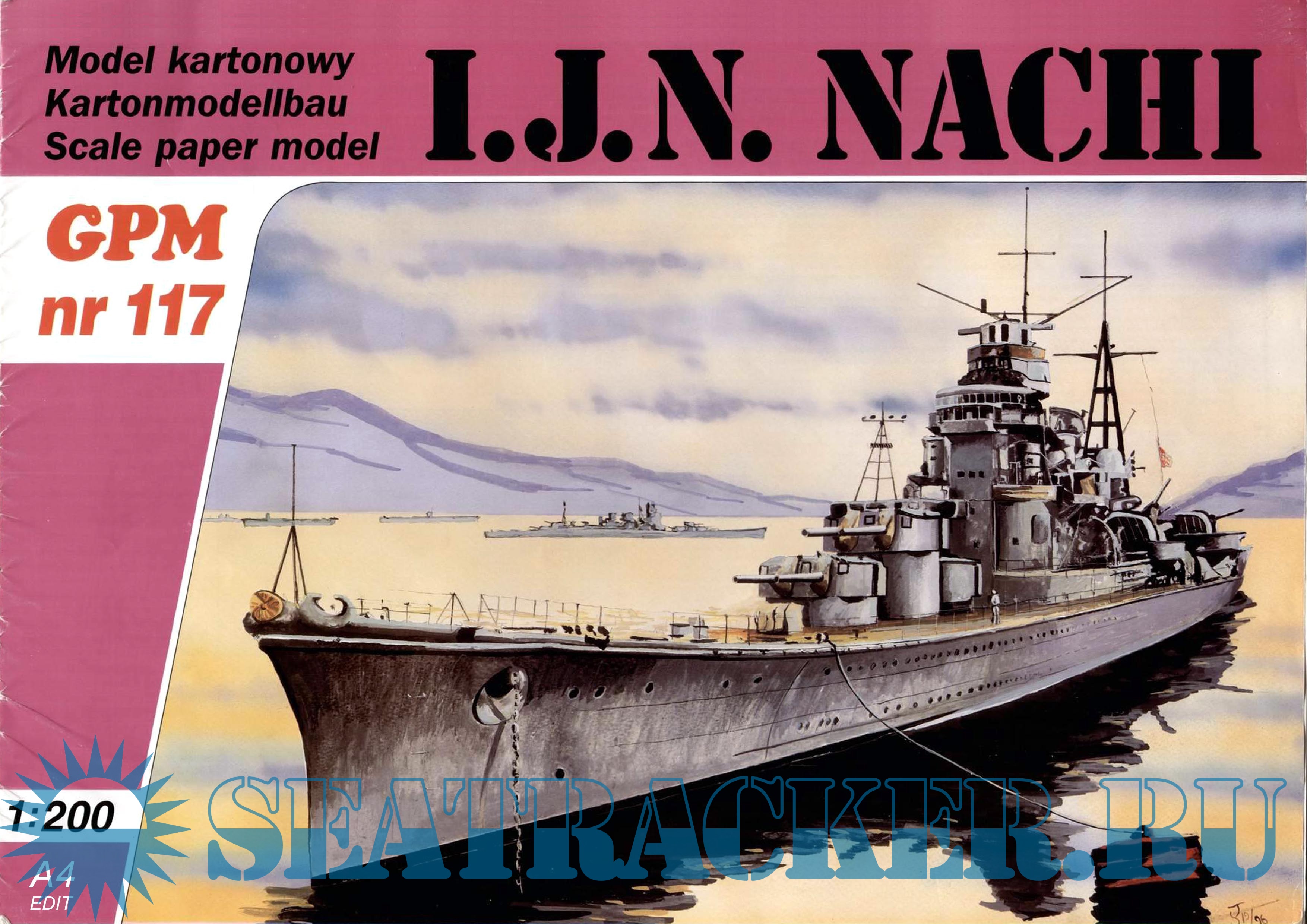 27 листов цветных выкроек и инструкций для изготовления бумажной модели тяжёлого крейсера IJN NACHI в масштабе 1:200