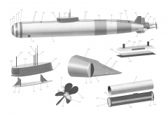 Описание: 9 листов цветных выкроек и инструкций для изготовления бумажной модели атомной подводной лодки К-222 проект 661 "Анчар" в масштабе 1:200