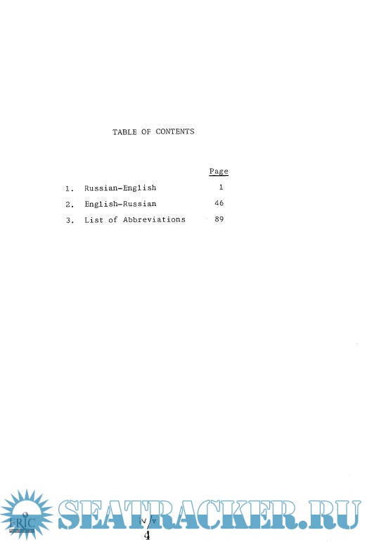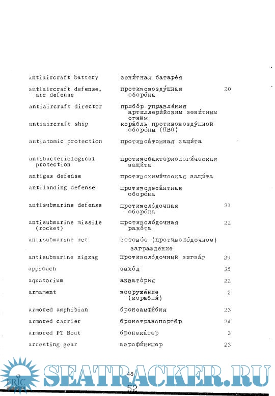 Description: This dictionary is a companion to "Naval Terminology," developed by the Defense Language Institute and printed in 1971. Cyrillic script is usd for the Russian terminology. Two main sections define naval terms from Russian to English and from English to Russian. A list of abbreviations concludes the text.