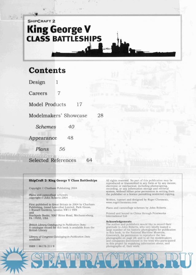 Year: 2004 Language: english Author: Roger Chesneau Genre: Technical book Publisher: Chatman Publishing Edition: ShipCraft 02 Format: PDF Quality: Scanned pages Pages count: 35 Description: The second volume in a new series providing ship modellers with all they need to know about a famous class of warship and associated model kits. The five battleships of the King George V class were the most modern to serve the Royal Navy in World War II; all rendered invaluable service in the war effort, and, indeed, the first two could be credited with influencing the very course of the conflict. Instrumental in the sinking of the battleship Bismarck, they bought about a fundamental shift in German naval policy, the emphasis moving away from heavy surface ships and towards the U-boat arm. With its unparalleled level of visual information - colour schemes, models, line drawings and photographs - it is simply the best reference for any modelmaker setting out to build one these great battleships.