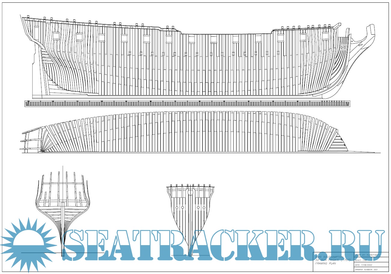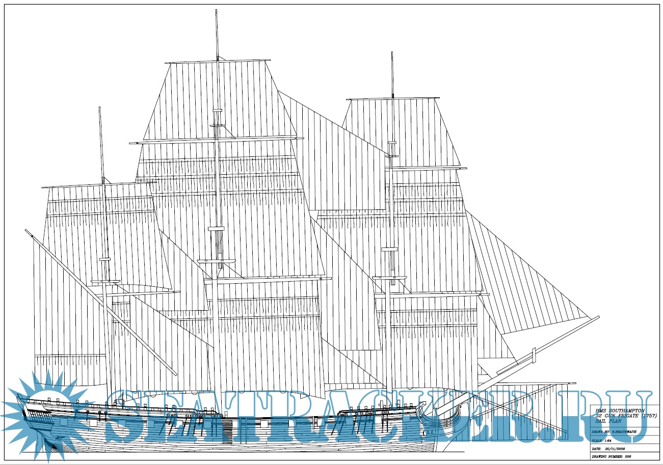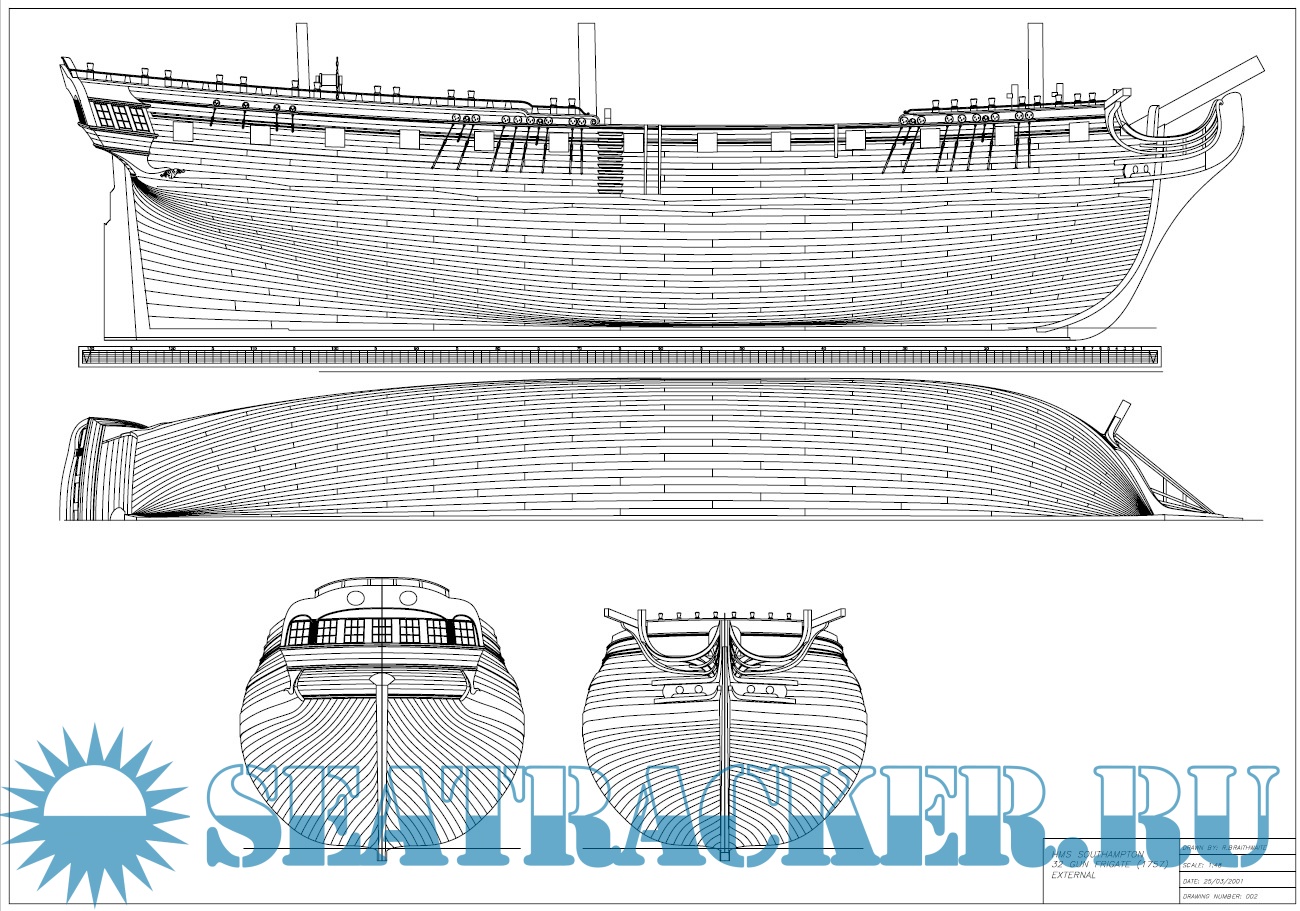Чертежи 32-пушечного фрегата HMS "Southampton" 1757 год в масштабе 1:48