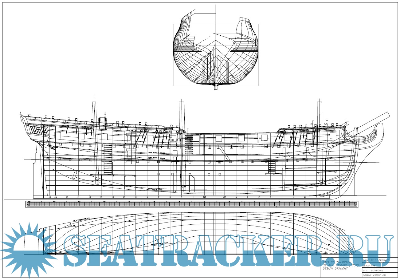 Чертежи и описание 32-пушечного фрегата HMS "Southampton" 1757 год в масштабе 1:48