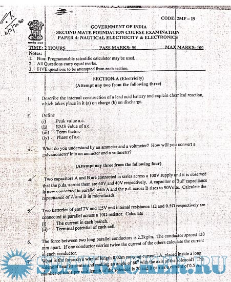 Year: 2017-2020 Language: english Author: D.G. Shipping, India Format: JPEG Quality: Photo of pages Pages count: Multiple Description: Second Mate Foundation Course (2MFC) Question Paper Sets for Mercantile Marine Department, India Examinations Paper 1: Nautical Mathematics Paper 2: Nautical Physics Paper 3: Nautical Chemistry Paper 4: Nautical Electricity and Electronics