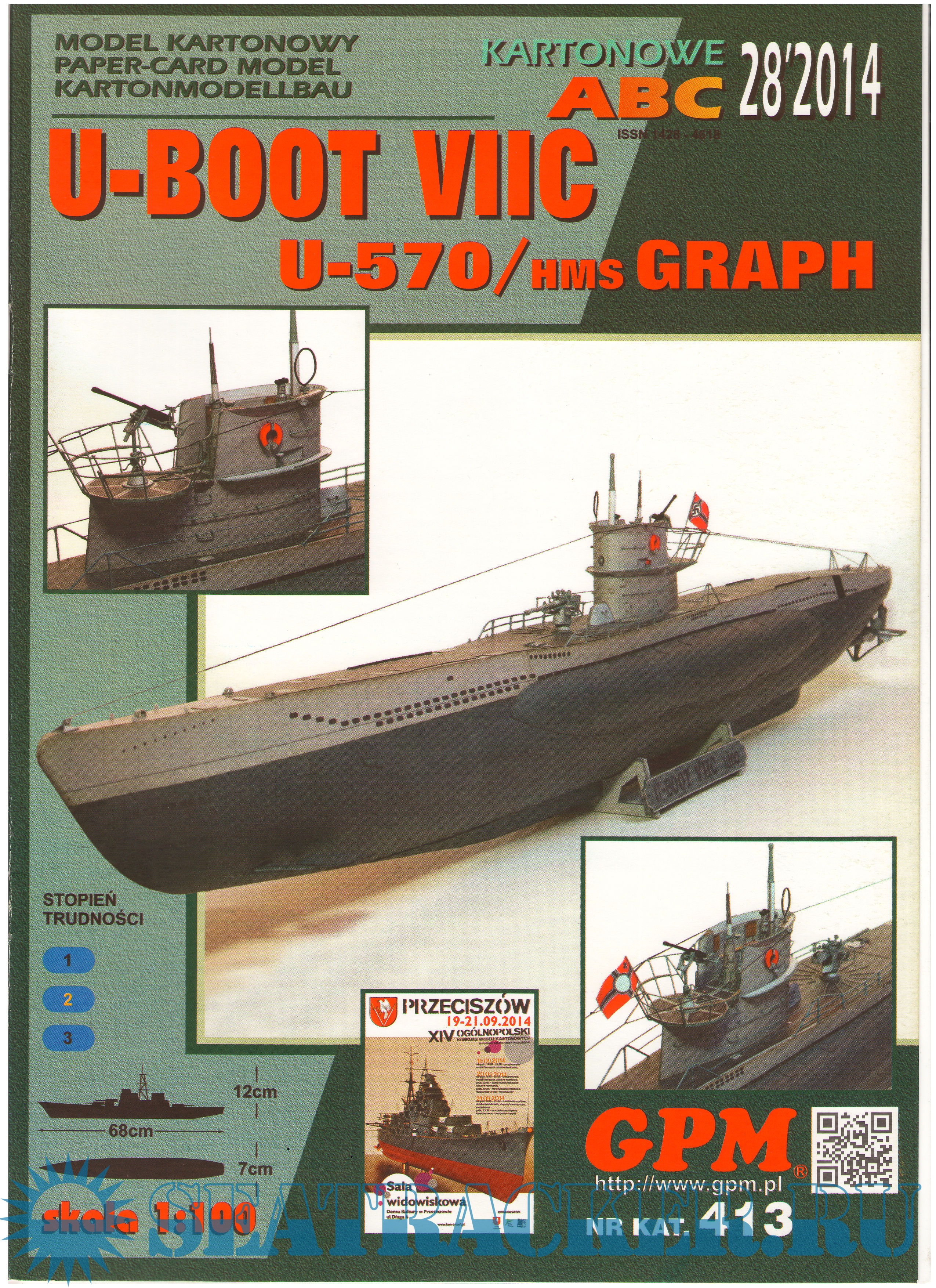 16 листов цветных выкроек и инструкций для изготовления бумажной модели германской подводной лодки U-570 в масштабе 1:100