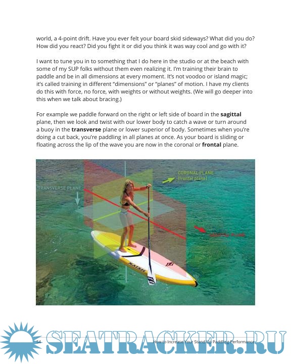 There are hundreds of step-by-step photographs showing exactly how to increase your SUP performance. Improving your cardio capacity and endurance, learning how to develop better balance and faster reaction times for changing conditions, breaking waves or tight buoy turns; are just some of the many ways she will help you increase your paddle board performance.