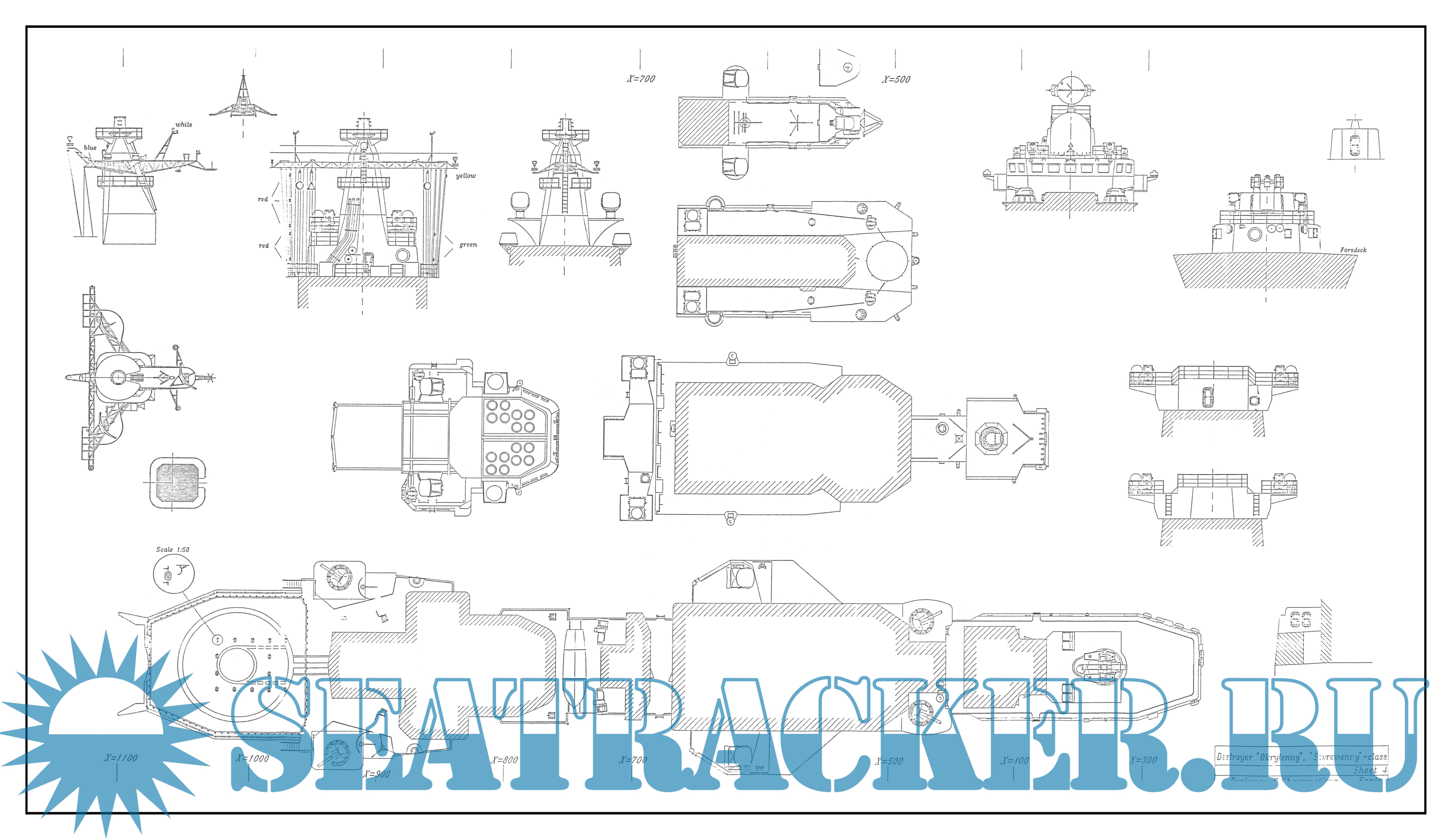 6 листов чертежей эсминца "ОКРЫЛЁННЫЙ" проект 956 в масштабе 1:100