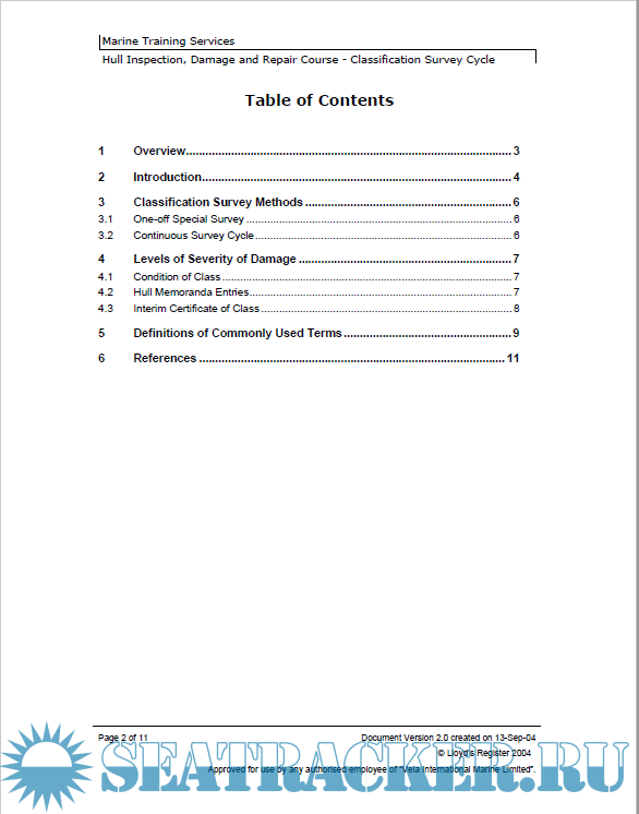 Year: 2004 Language: english Author: Lloyd's Register - Marine Training Services Genre: Technical book Format: PDF Quality: Scanned pages Pages count: 271 Description: This document covers the following topics: 1. An introduction to survey cycle and different types of survey 2. The main methods of surveying ships 3. The three levels of severity that can be assigned to damage and defects 4. Definition of some commonly used terms relating to surveys 5. A discussion of hull memoranda 6. A list of the main points that you need to bear in mind when preparing survey reports 7. A list of references used in this document Additional info: Document version 2.0. Delegate Handout Prepared by Lloyd's Register - Marine Training Services