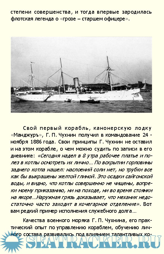 Год выпуска: 2015 Язык: русский Автор: Бойко В. Н. Жанр: История Издательство: Горизонт Издание: Жизнь замечательных моряков Формат: FB2 Качество: Изначально компьютерное (eBook) Количество страниц: 94 Описание: Об адмирале Григории Павловиче Чухнине, который был одним из самых заметных командующих Черноморским флотом в XIX веке, выполнявшим данную им присягу на верность Царю и Отечеству написано очень мало. По советской, официальной истории, адмирал Чухнин был «царский сатрап», исключительно тупой и исполнительный держиморда, беспринципный карьерист. Это не так! Григорий Павлович был совсем другим человеком. Основу его жизни составляли принципы морали и не в карьере он видел смысл жизни, а в служение Отечеству и флоту, ради которого он не щадил ни себя, ни других. Это и составило ему репутацию настоящего моряка. Недаром вслед за гибелью русской эскадры в Цусимском сражении передовое русское общество, отвечая на вопрос — кто мог бы с большим успехом осуществить задуманную операцию, назвало всего лишь три фамилии: Макаров, Дубасов и Чухнин. В книге подробно описан боевой путь русского адмирала и трагедия его убийства