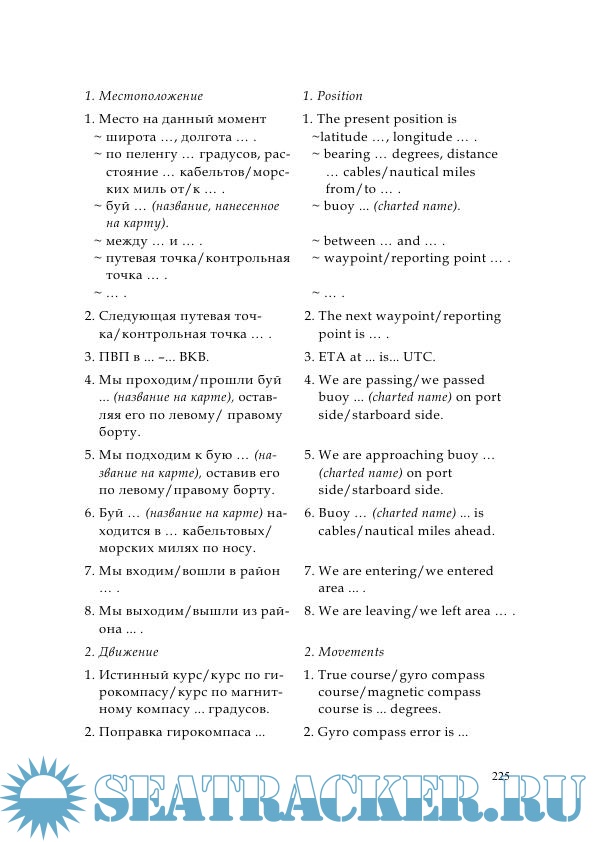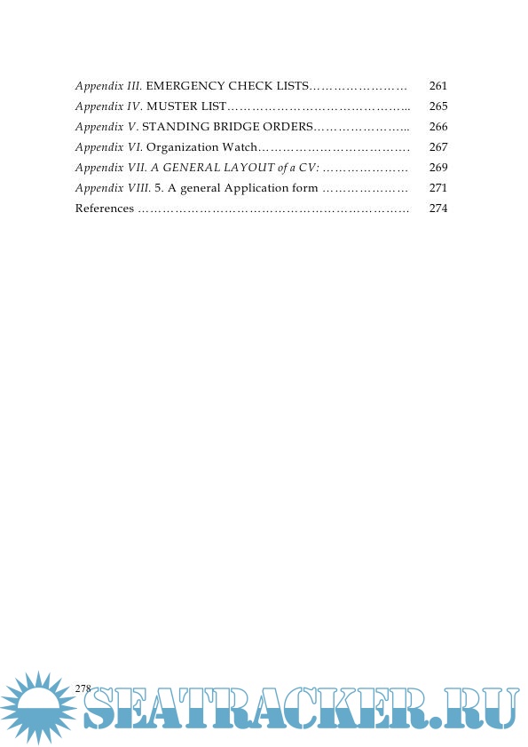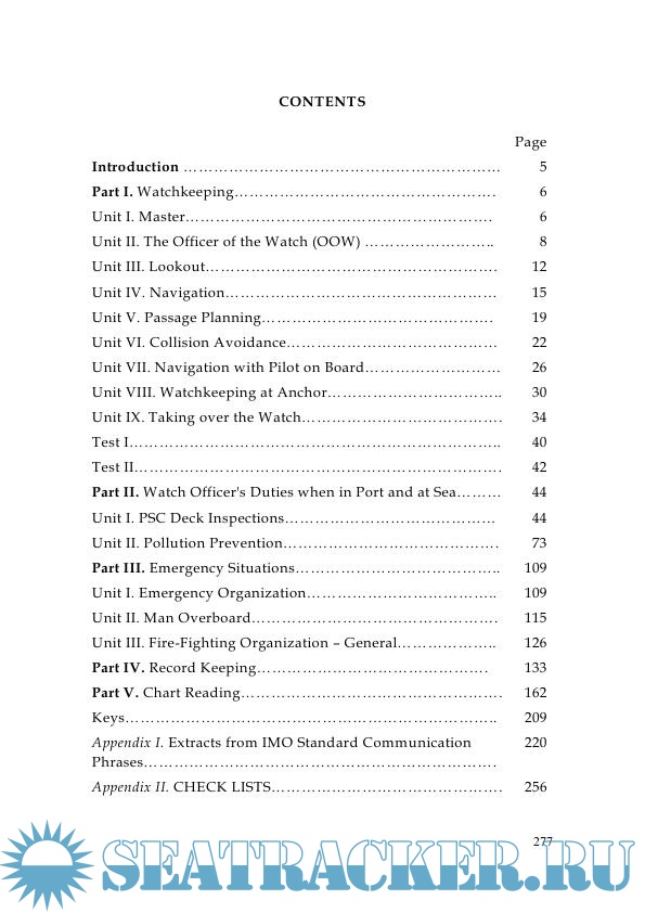 Year: 2010 Language: english / russian Author: Казинская О.Я., Ямченко Л.М. Genre: Textbook Publisher: МГУ им. адм. Г.И. Невельского (Морской государственный университет им. адмирала Г. И. Невельского) Edition: 2nd Format: PDF Quality: Scanned pages Pages count: 279 Description: Цель пособия – дальнейшее развитие навыков устной речи, расширение и систематизация словарного запаса. Пять разделов пособия охватывают темы, необходимые для работы вахтенного помощника капитана. Текстовой материал взят из международных конвенций, пособий, издаваемых Морским институтом Соединенного королевства для судоводителей, а также из инструкций судоходных компаний. Предназначается для курсантов старших курсов специальности 180402.65 "Судовождение". Также пособие может быть использовано при подготовке вахтенных помощников к аттестации по английскому языку.; Гриф : Рекомендовано Дальневосточным региональным учебно-методическим центром (ДВ РУМЦ) в качестве учебного пособия для курсантов старших курсов специальности 180402.65 "Судовождение" The purpose of the manual is the further development of oral speech skills, the expansion and systematization of vocabulary. The five sections of the manual cover the topics necessary for the work of an officer on duty. The text material is taken from international conventions, manuals published by the United Kingdom Maritime Institute for boatmasters, as well as from the instructions of shipping companies. Designed for senior cadets of the specialty 180402.65 "Navigation". Also, the manual can be used in the preparation of shift assistants for certification in English.
