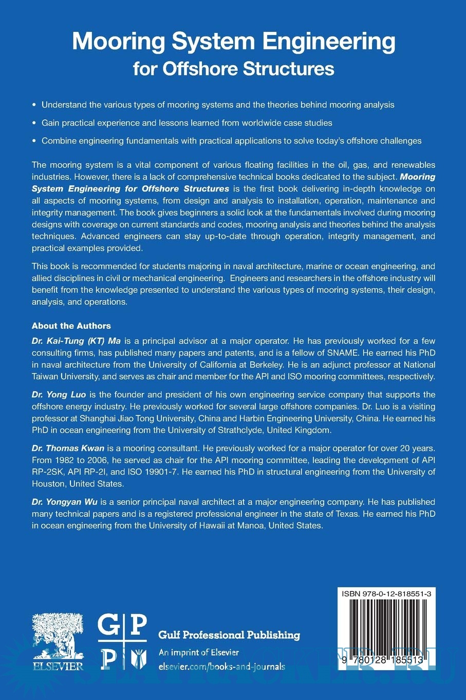 Description: The mooring system is a vital component of various floating facilities in the oil, gas, and renewables industries. However, there is a lack of comprehensive technical books dedicated to the subject. Mooring System Engineering for Offshore Structuresis the first book delivering in-depth knowledge on all aspects of mooring systems, from design and analysis to installation, operation, maintenance and integrity management. The book gives beginners a solid look at the fundamentals involved during mooring designs with coverage on current standards and codes, mooring analysis and theories behind the analysis techniques. Advanced engineers can stay up-to-date through operation, integrity management, and practical examples provided. This book is recommended for students majoring in naval architecture, marine or ocean engineering, and allied disciplines in civil or mechanical engineering. Engineers and researchers in the offshore industry will benefit from the knowledge presented to understand the various types of mooring systems, their design, analysis, and operations.