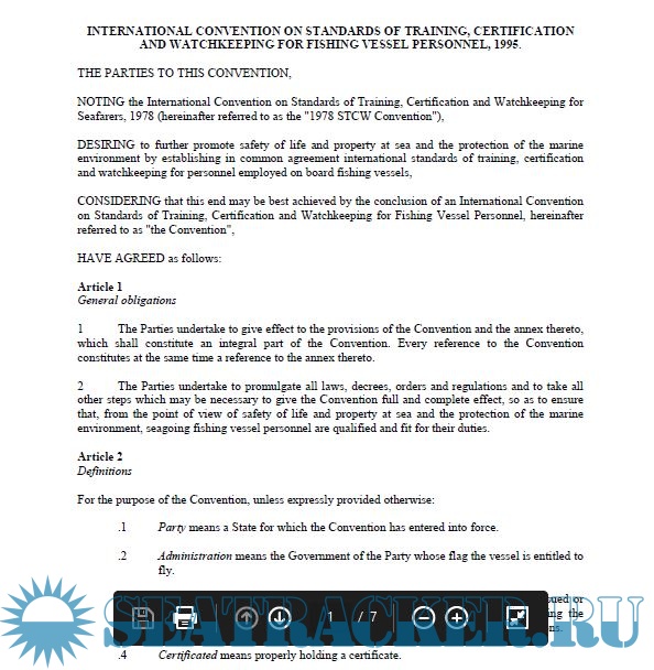 Description: The International Convention on Standards of Training, Certification and Watchkeeping for Fishing Vessel Personnel (STCW-F), was adopted by IMO in 1995. The 1995 STCW-F Convention is a binding treaty that sets certification and minimum training requirements for crews of seagoing fishing vessels with the aim to promote the safety of life at sea and the protection of the marine environment, taking into account the unique nature of the fishing industry and the fishingworking environment.