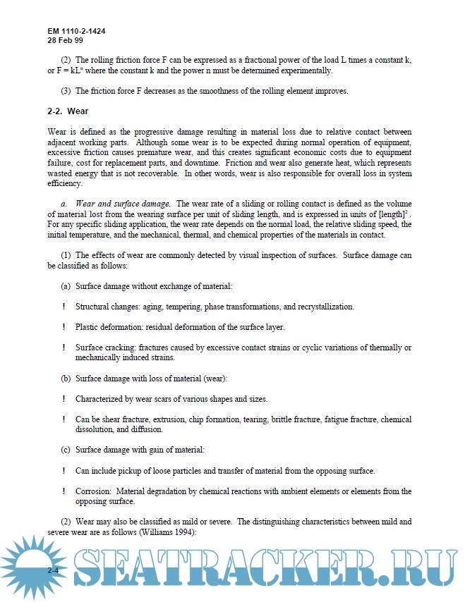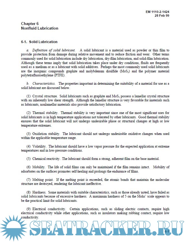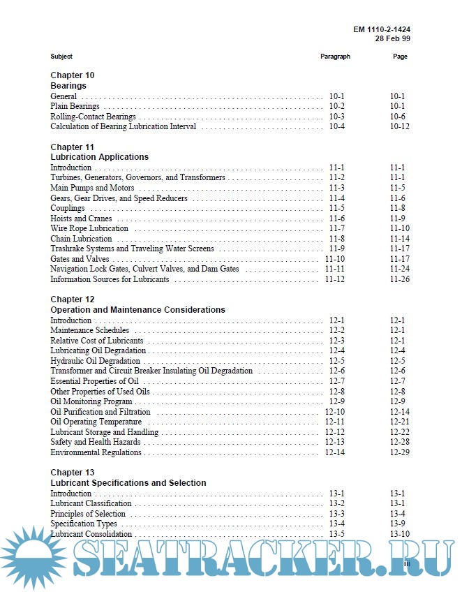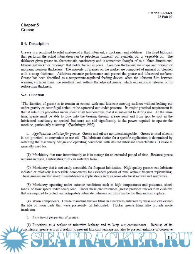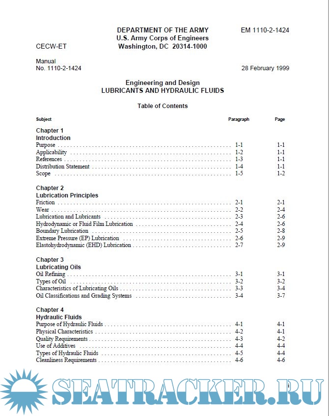 Year: 1999 Language: english Author: U.S. Army Corps of Engineers Genre: Manual Format: PDF Quality: Scanned pages + text layer Pages count: 197 Description: This manual is intended to be a practical guide to lubrication with enough technical detail to allow personnel to recognize and easily discern differences in performance properties specified in manufacturers’ product literature so that the proper lubricant for a particular application is selected. It describes basic characteristic properties of oils, hydraulic fluids, greases, solid lubricants, environmentally acceptable lubricants, and their additives. It examines the mechanics of hydrodynamic, boundary, extreme pressure, and elastohydrodynamic lubrication to protect against surface deterioration. Separate chapters are devoted to lubricant specification and selection, and requirements of lubricants for equipment currently in use at USACE civil works facilities. Because conscientious adherence to lubrication schedules is the best prescription for longevity of component parts, operation and maintenance considerations are also addressed. Additional info: Approved for public release, distribution is unlimited
