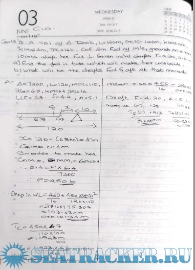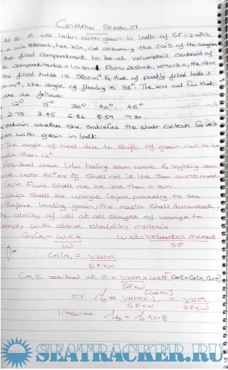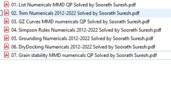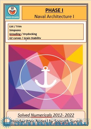 Year: 2022 Language: english Author: Soorath Suresh Format: JPEG Quality: Photo of pages Pages count: Multiple Description: Paper: Naval Architecture I Solved Numericals (2022-2012) from Past Question Papers of Mercantile Marine Department (MMD), India Examinations for Phase I (Chief Mate F.G.) Topics covered: 1. List 2. Trim 3. GZ Curves 4. Simpson's Rules 5. Grounding 6. Dry Docking 7. Grain Stability