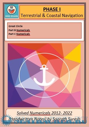 Year: 2022 Language: english Author: Soorath Suresh Format: JPEG Quality: Photo of pages Pages count: Multiple Description: Paper: Terrestrial and Coastal Navigation Solved Numericals (2022-2012) from Past Question Papers of Mercantile Marine Department (MMD), India Examinations for Phase I (Chief Mate F.G.) Topics covered: 1. Great Circle 2. Part B Numericals 3. Part C Numericals