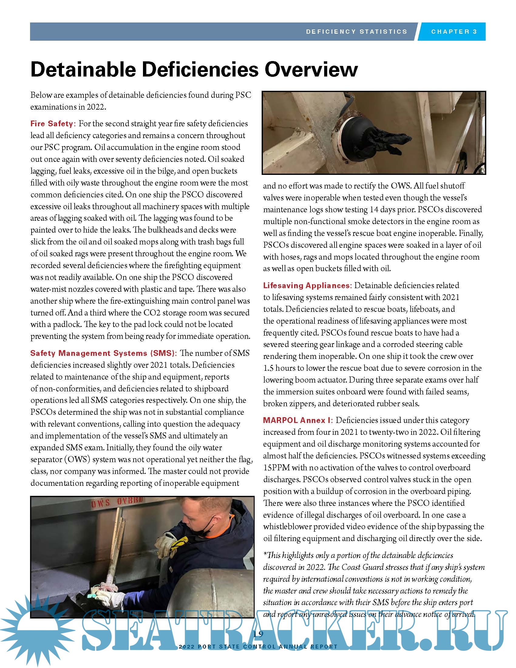 Description: The United States Coast Guard’s Office of Commercial Vessel Compliance has released its 2021 annual report over US port state controls. The aim of the report is to “provide the global maritime industry key statistics and compliance trends in relation to compliance with U.S. and international regulations, such as the Safety of Life at Sea (SOLAS), International Convention for the Prevention of Pollution from Ships (MARPOL), and the International Ship and Port Facility Security Code (ISPS).”