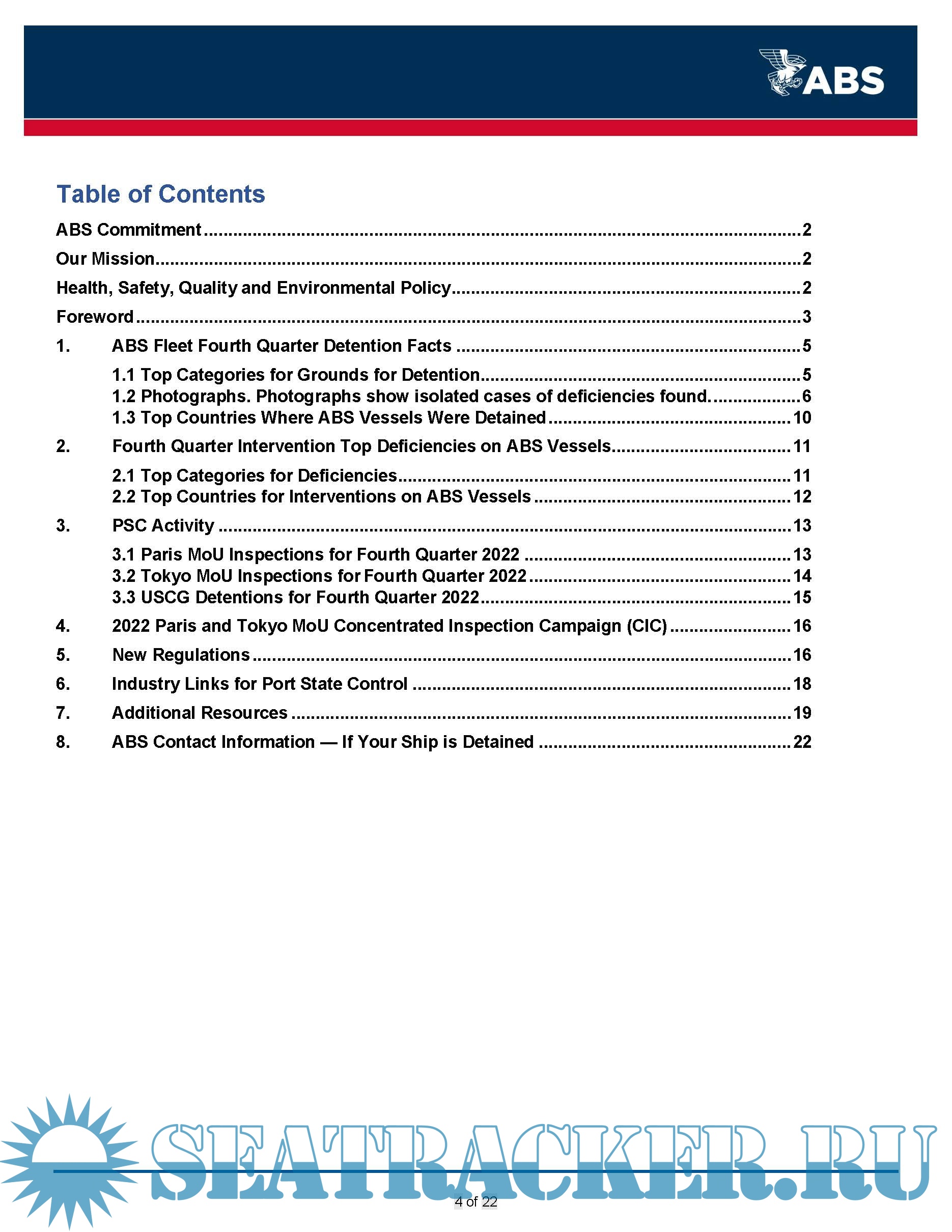 Description: The ABS Quarterly Report on Port State Control (PSC) provides information to owners on deficiencies identified on ABS vessels during inspections carried out by the various PSC regimes globally during the 4th Quarter of 2022. This report is made available to assist owners by providing awareness of potential areas of concern that have been identified on ABS classed vessels.