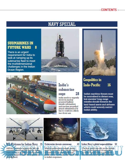 The issue analyses the strategic significance of the submarine fleet expansion. The edition also carries an extensive feature on the role of the Indian Navy in the Indo-Pacific region. Detailed articles on the MQ-9B drone deal for the Indian Navy, underwater domain awareness, strengthening coastal security, and Indian Navy’s global responsibilities, make the edition a very interesting read.