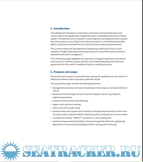 Year: 2014 Language: english Author: OCIMF Genre: Guide Publisher: OCIMF Edition: 1st Format: PDF Quality: Unknown Pages count: 8 Description: The widespread introduction of machinery automation and associated alarm and control systems has significantly changed the nature of operational practices on board vessels. The extensive use of computers, monitoring tools and equipment has increased the volume and accuracy of data to the extent that there is a risk that the responsible officer may become insulated from the actual machinery status and performance. The current professional development of engineering staff tends to focus on the operation of highly automated vessels and may lack some of the practical elements associated with plant management. This information paper highlights the importance of regular inspections and routine walk-rounds of machinery spaces with the aim of addressing the perceived lack of appreciation for the need for traditional hands-on working practices.
