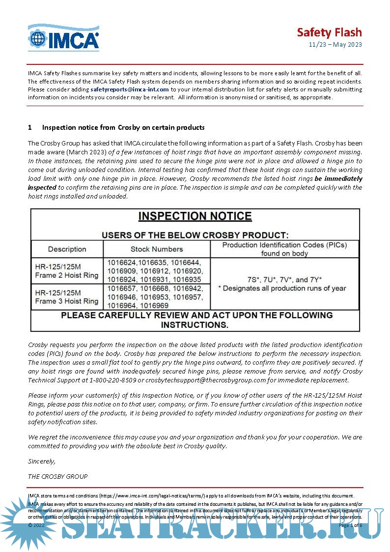 Description: The International Marine Contractors Association ( IMCA ) Safety Flashes disseminate important information on incidents and potential hazards and the lessons learnt from them that can help prevent incidents occurring elsewhere in the industry.IMCA Safety Flashes and systems for incident reporting and analysis are an important tool for sharing vital information.By publishing them, IMCA helps its members around the world identify potential hazards, share lessons learned and avoid repetition.Safety Flashes should be succinct, specific, factually correct and written in clear language.The Secretariat will assist with this through formatting and checking of the material submitted.