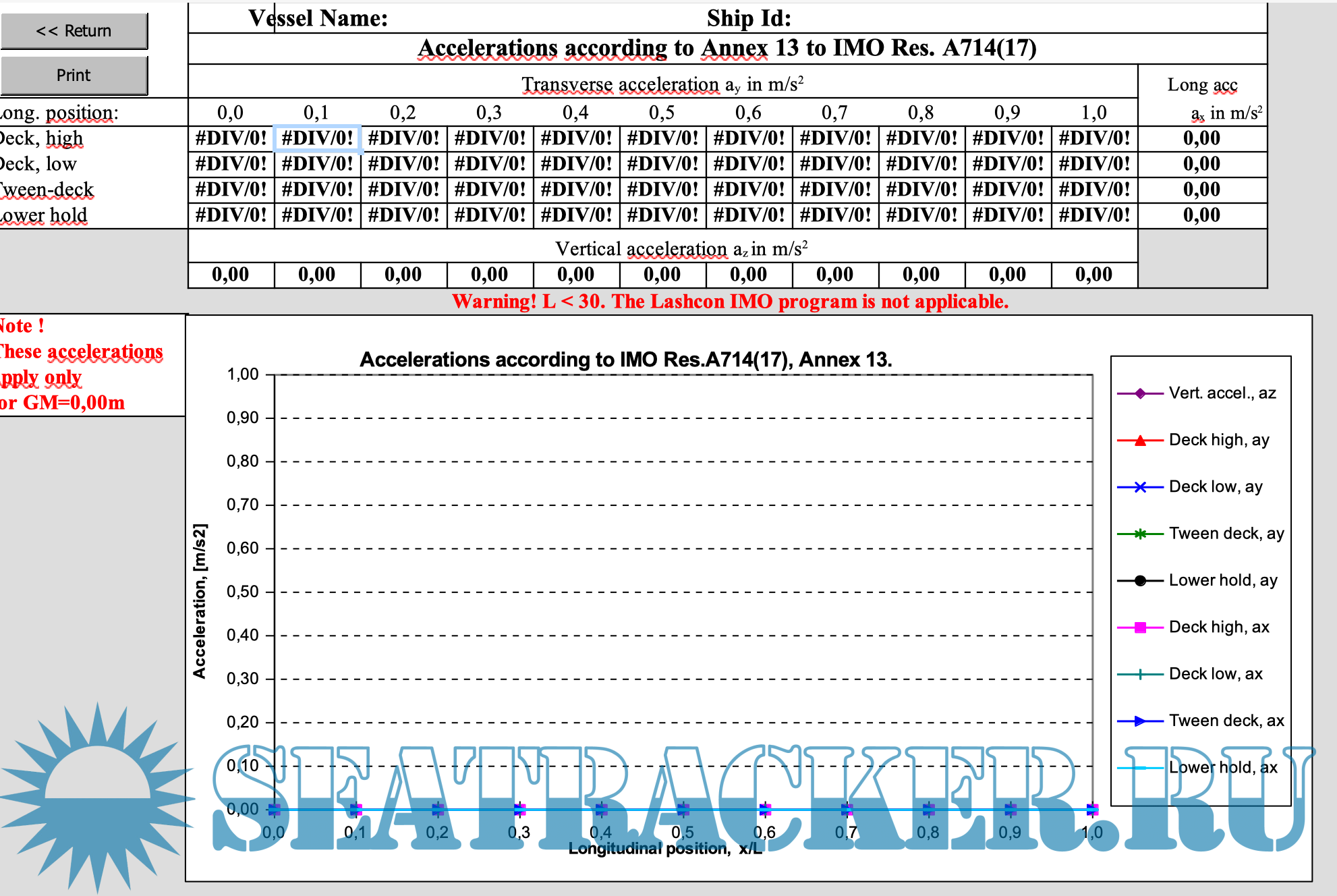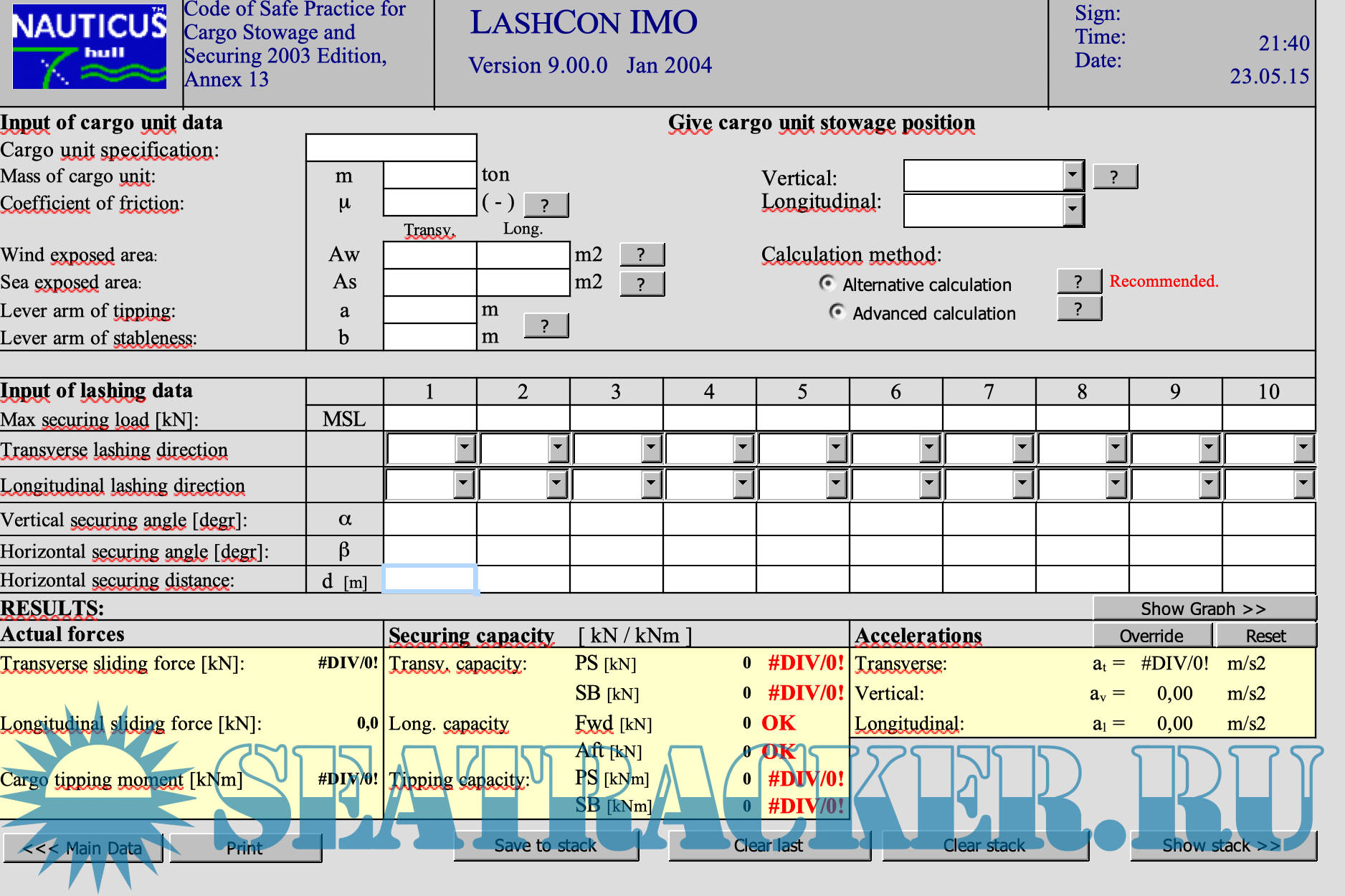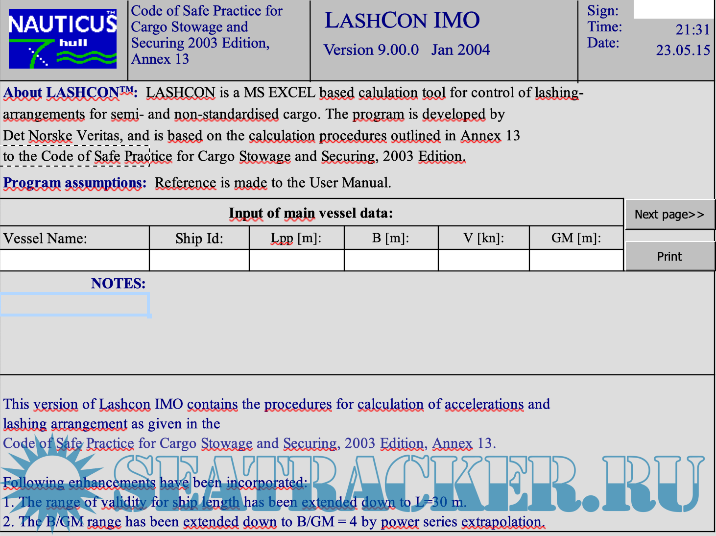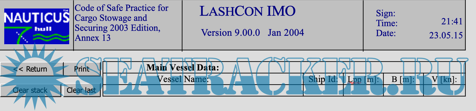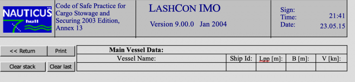 Description: About LASHCON: LASHCON is a MS EXCEL based calulation tool for control of lashing- arrangements for semi- and non-standardised cargo. The program is developed by Det Norske Veritas, and is based on the calculation procedures outlined in Annex 13 to the Code of Safe Practice for Cargo Stowage and Securing, 2003 Edition.